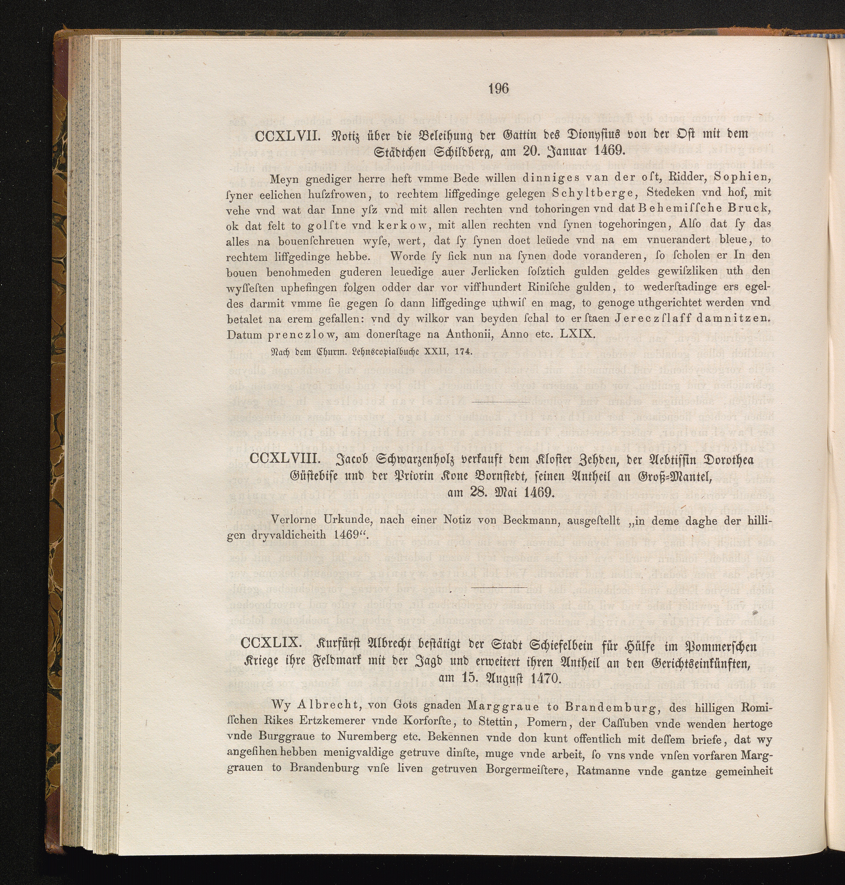 CCXLIX. Kurfürst Albrecht bestätigt der Stadt Schiefelbein für Hülfe im Pommerschen[...]