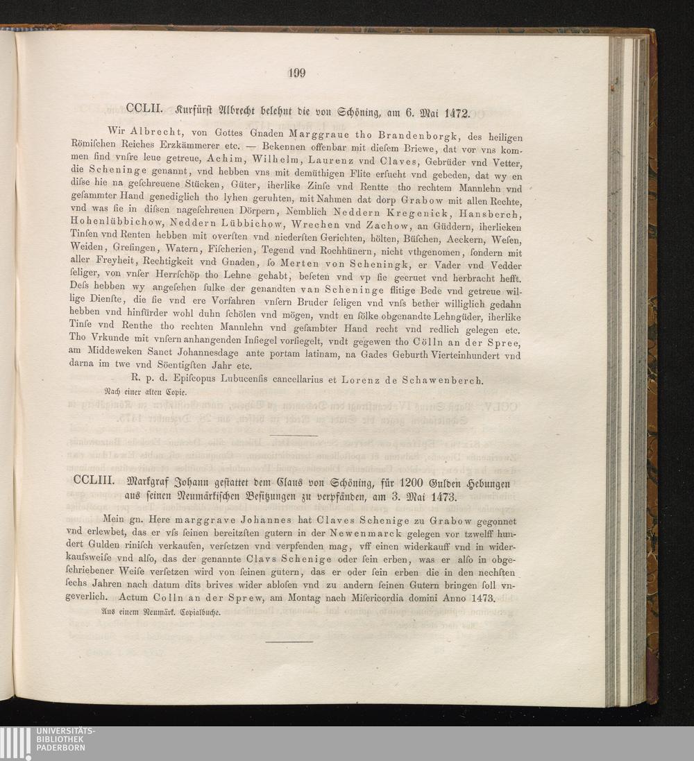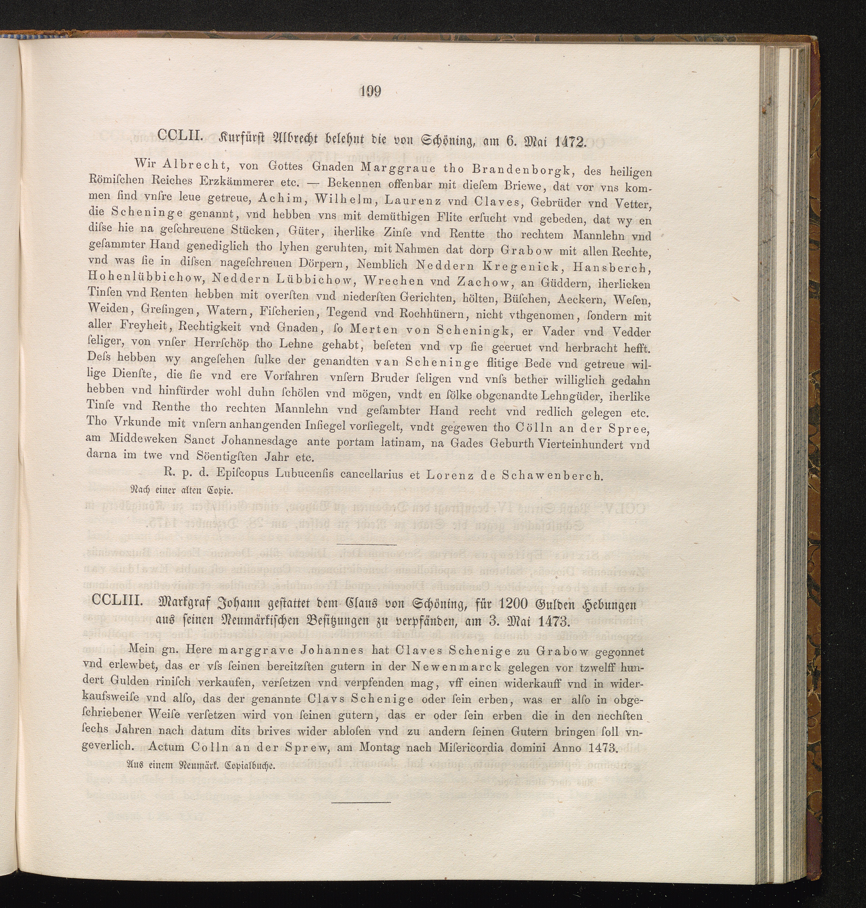 CCLIII. Markgraf Johann gestattet dem Claus von Schöning, für 1200 Gulden Hebungen[...]