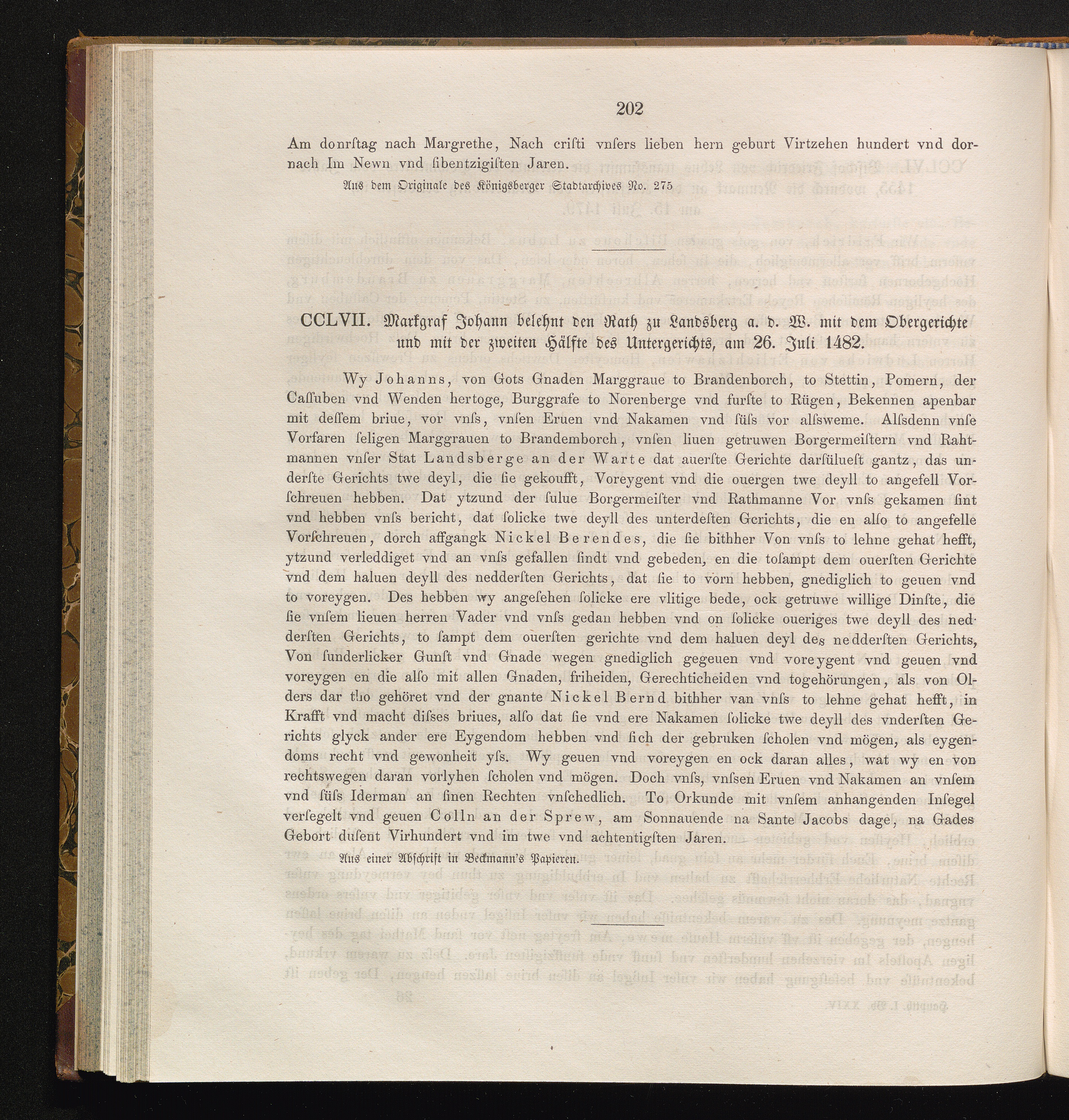 CCLVII. Markgraf Johann belehnt den Rath zu Landsberg a. d. W. mit dem Obergerichte[...]