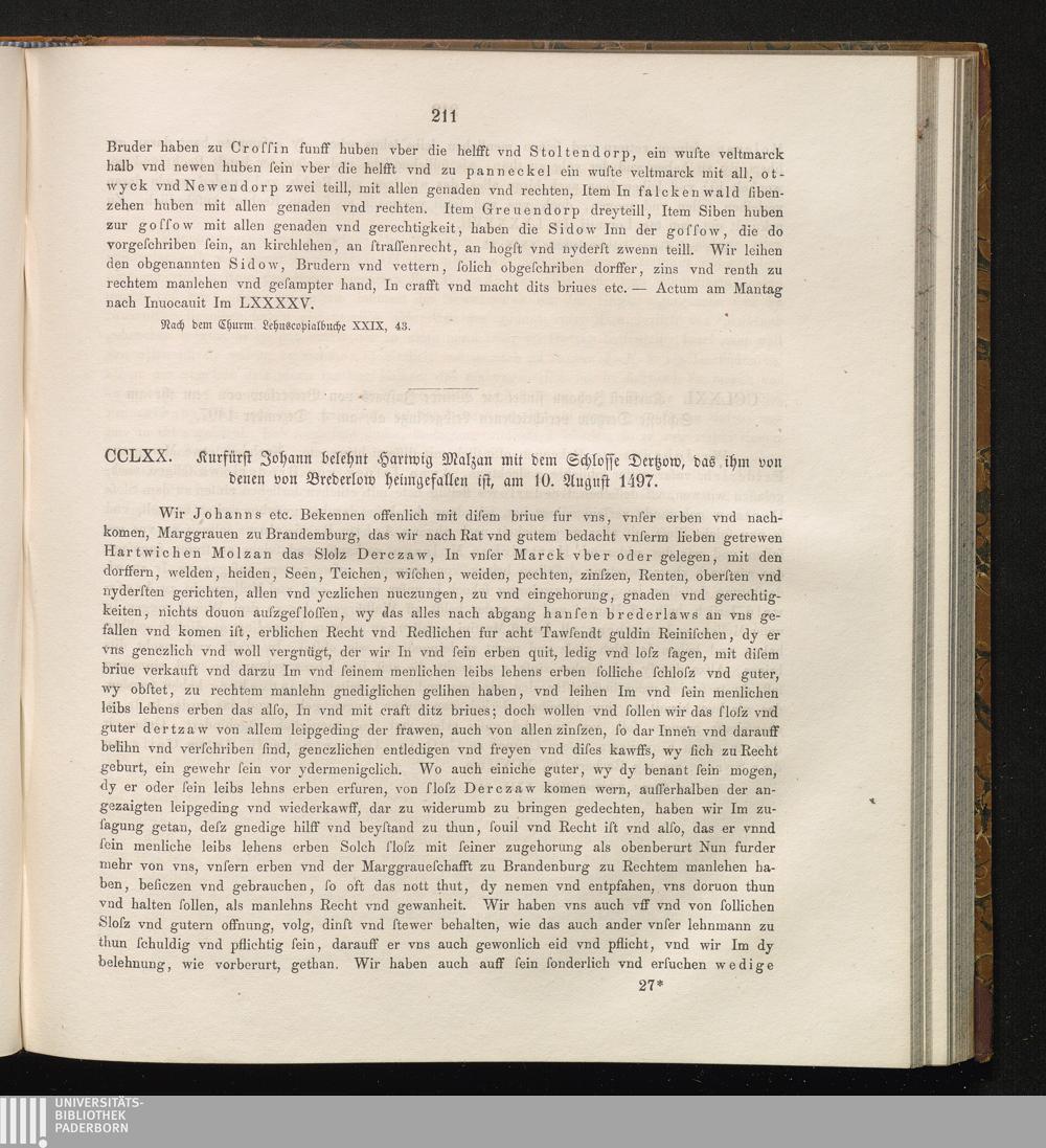 CCLXX. Kurfürst Johann belehnt Hartwig Malzan mit dem Schlosse Dertzow, das ihm von[...]