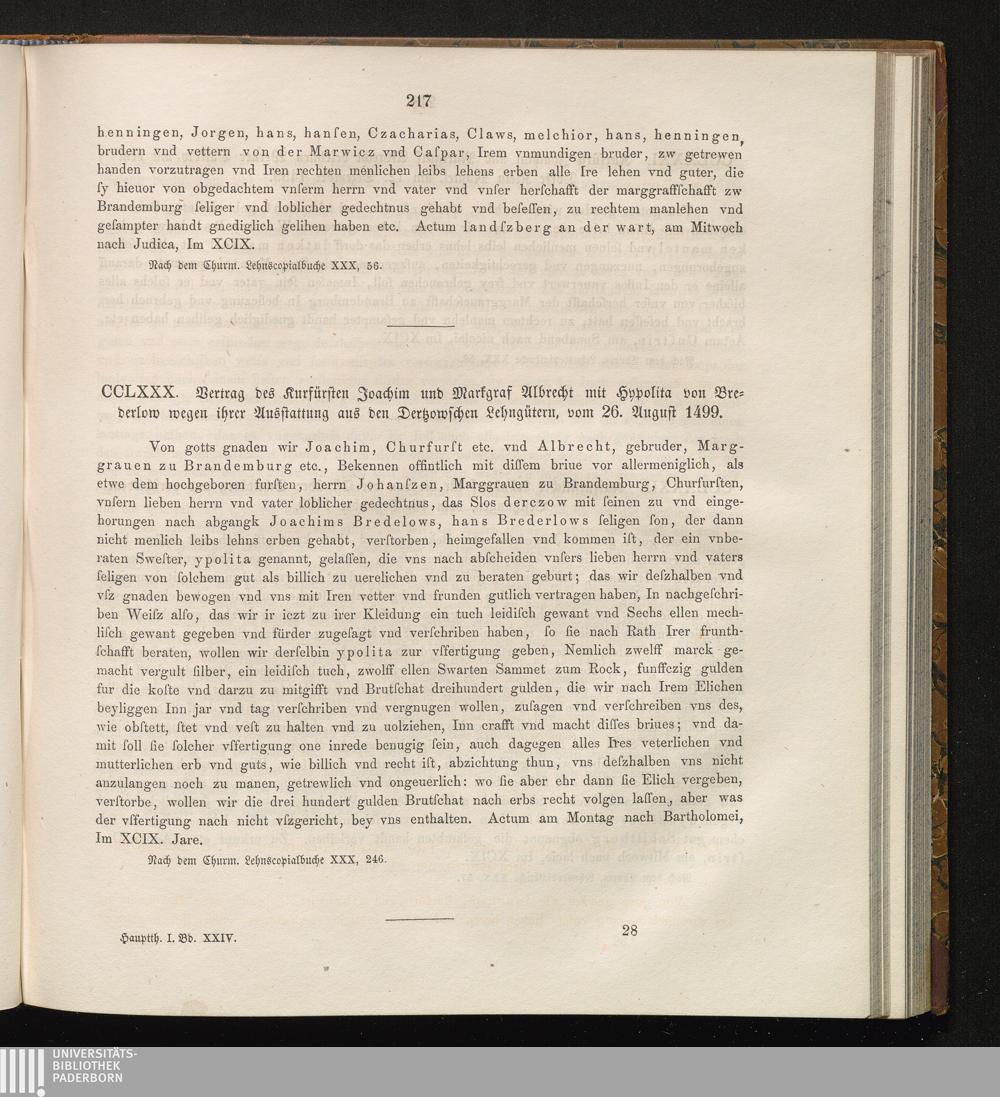 CCLXXX. Vertrag des Kurfürsten Joachim und Markgraf Albrecht mit Hypolita von Brederlow[...]