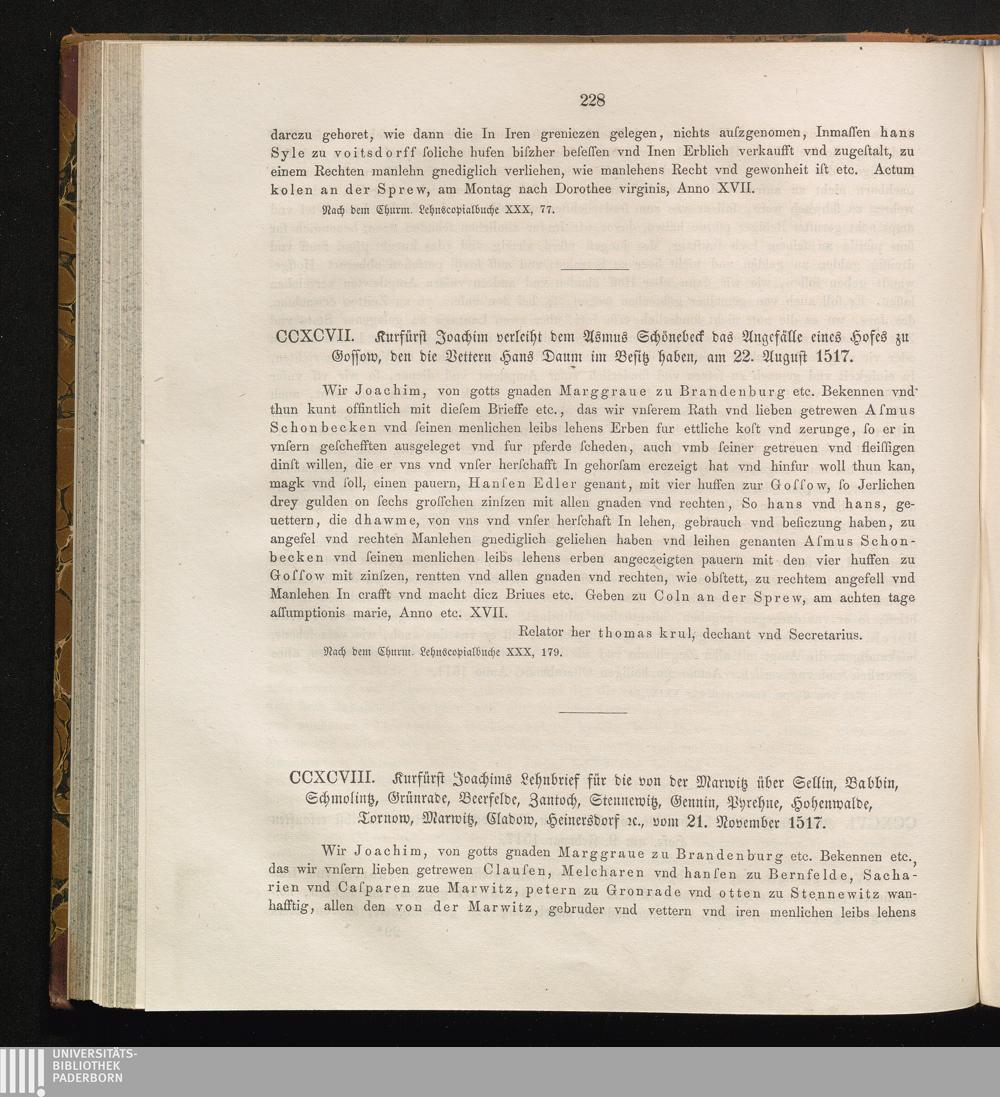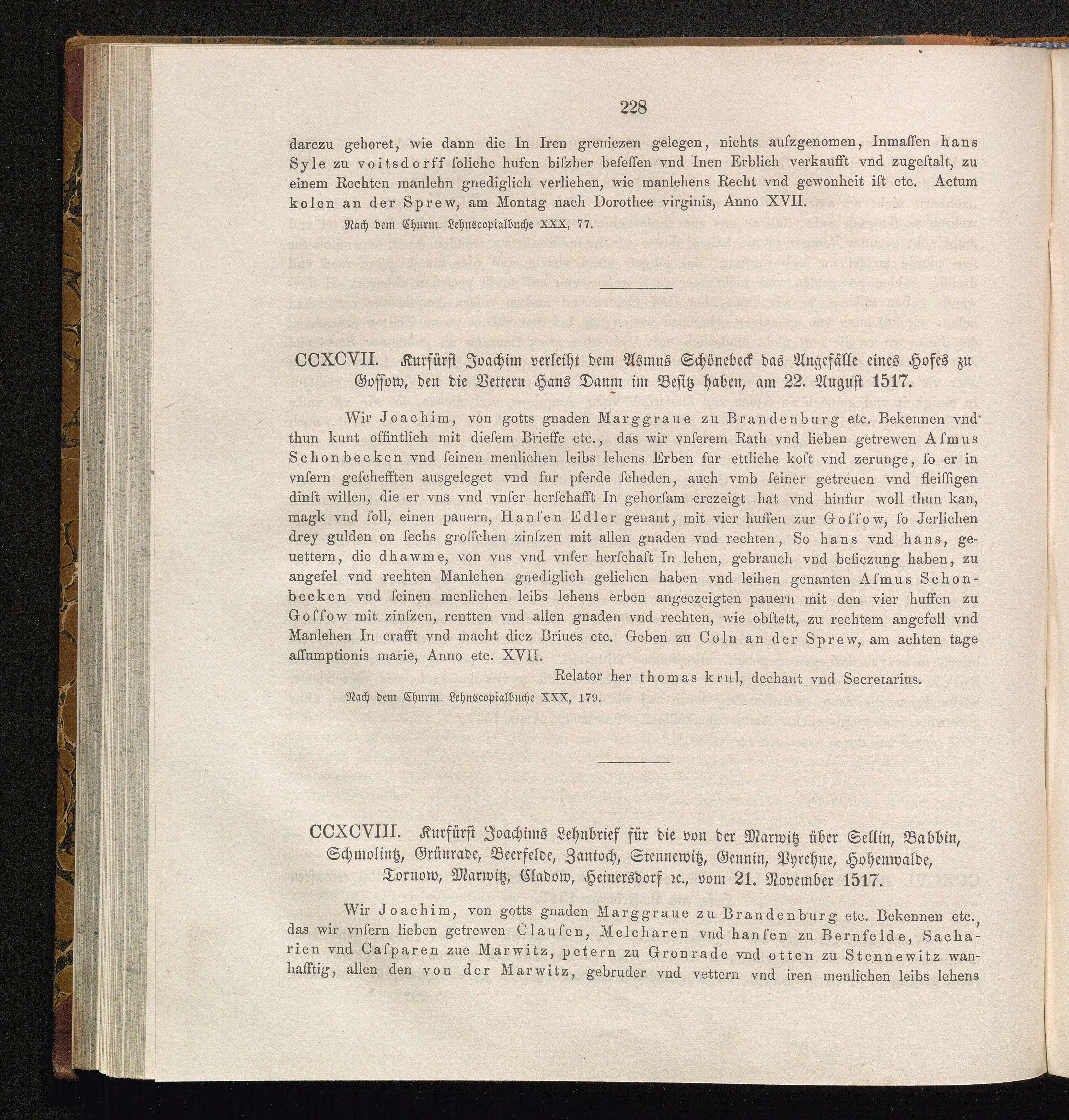 CCXCVIII. Kurfürst Joachims Lehnbrief für die von der Marwitz über Sellin, Babbin,[...]