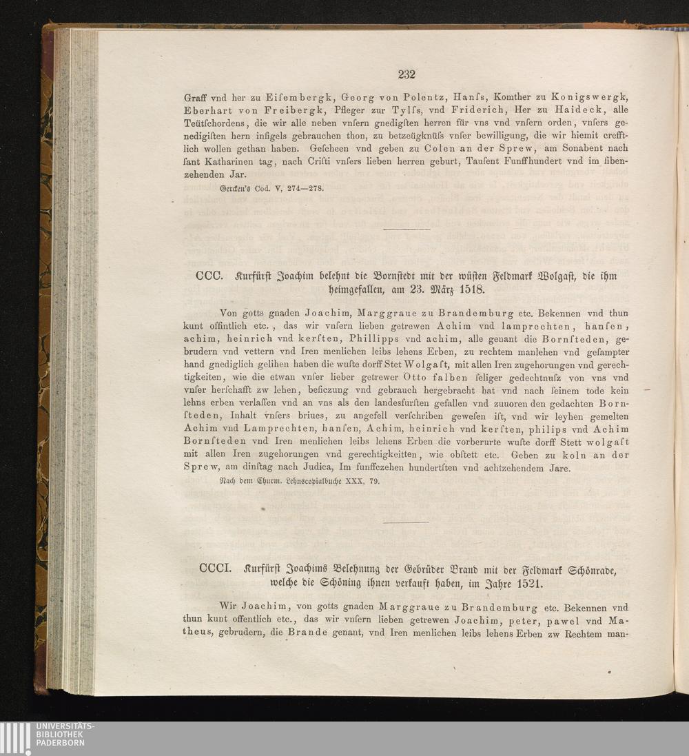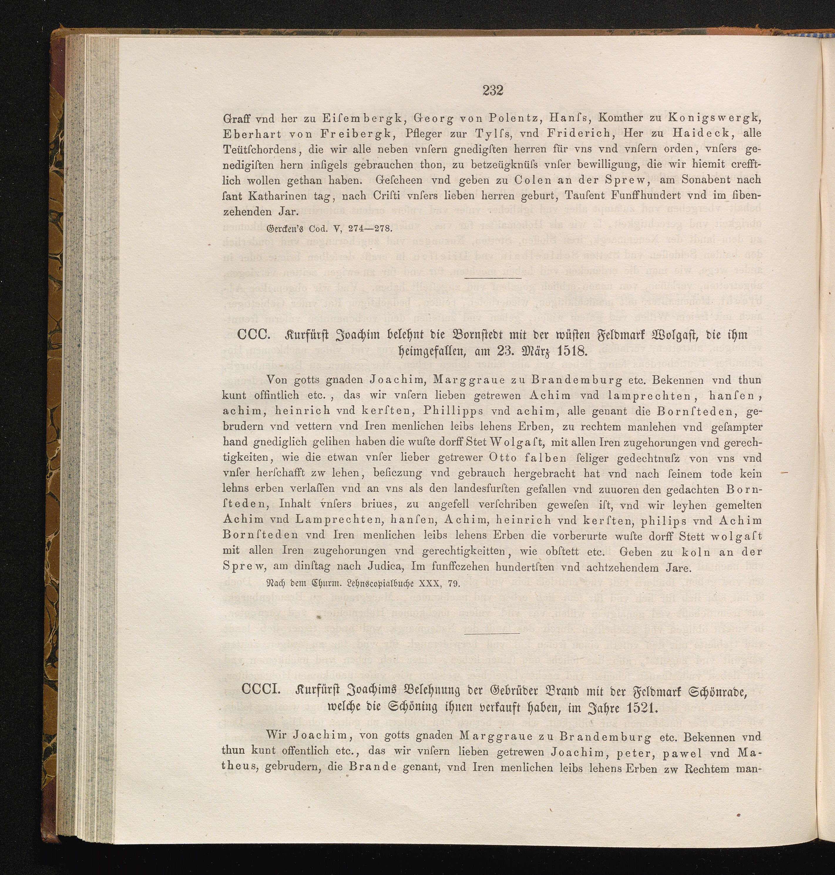 CCCI. Kurfürst Joachims Belehnung der Gebrüder Brand mit der Feldmark Schönrade,[...]