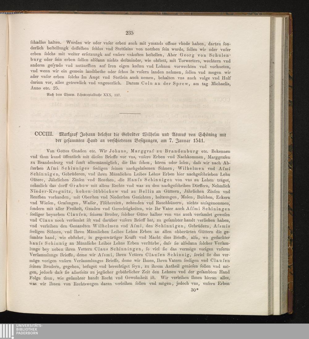 CCCIII. Markgraf Johann belehnt die Gebrüder Wilhelm und Asmus von Schöning mit der[...]