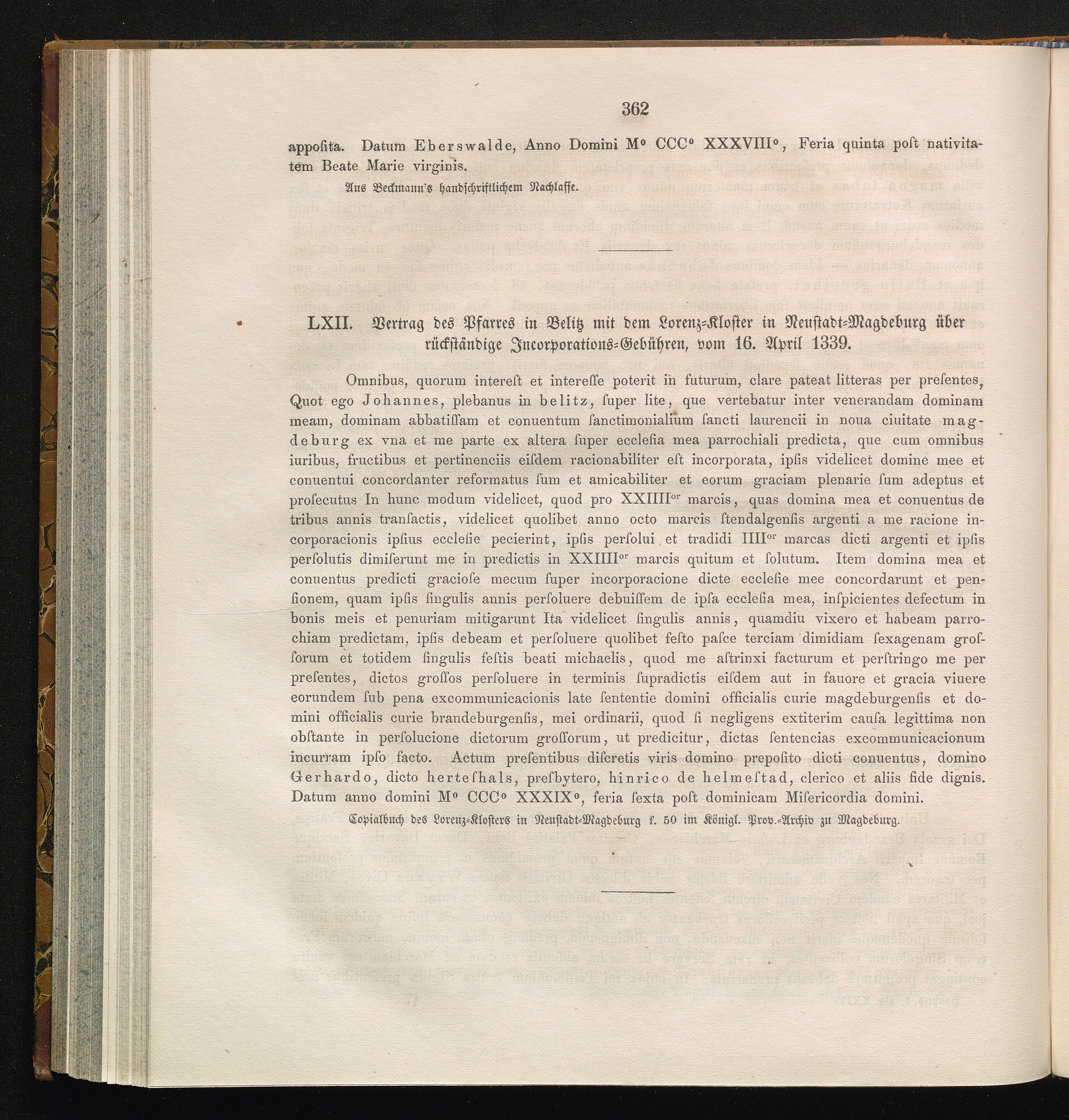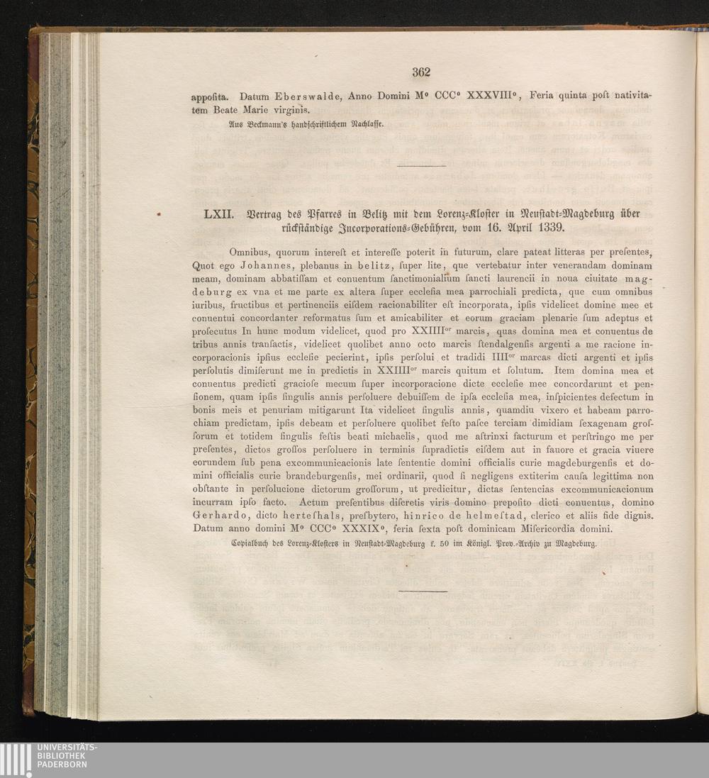 LXII. Vertrag des Pfarrers in Belitz mit dem Lorenz-Kloster in Neustadt-Magdeburg[...]
