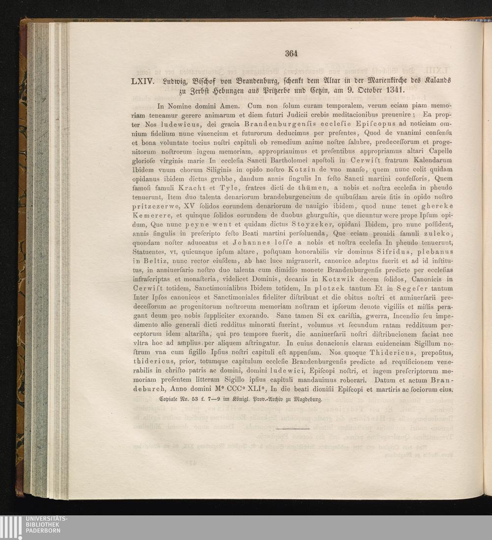 LXIV. Ludwig, Bischof von Brandenburg, schenkt dem Altar in der Marienkirche des[...]
