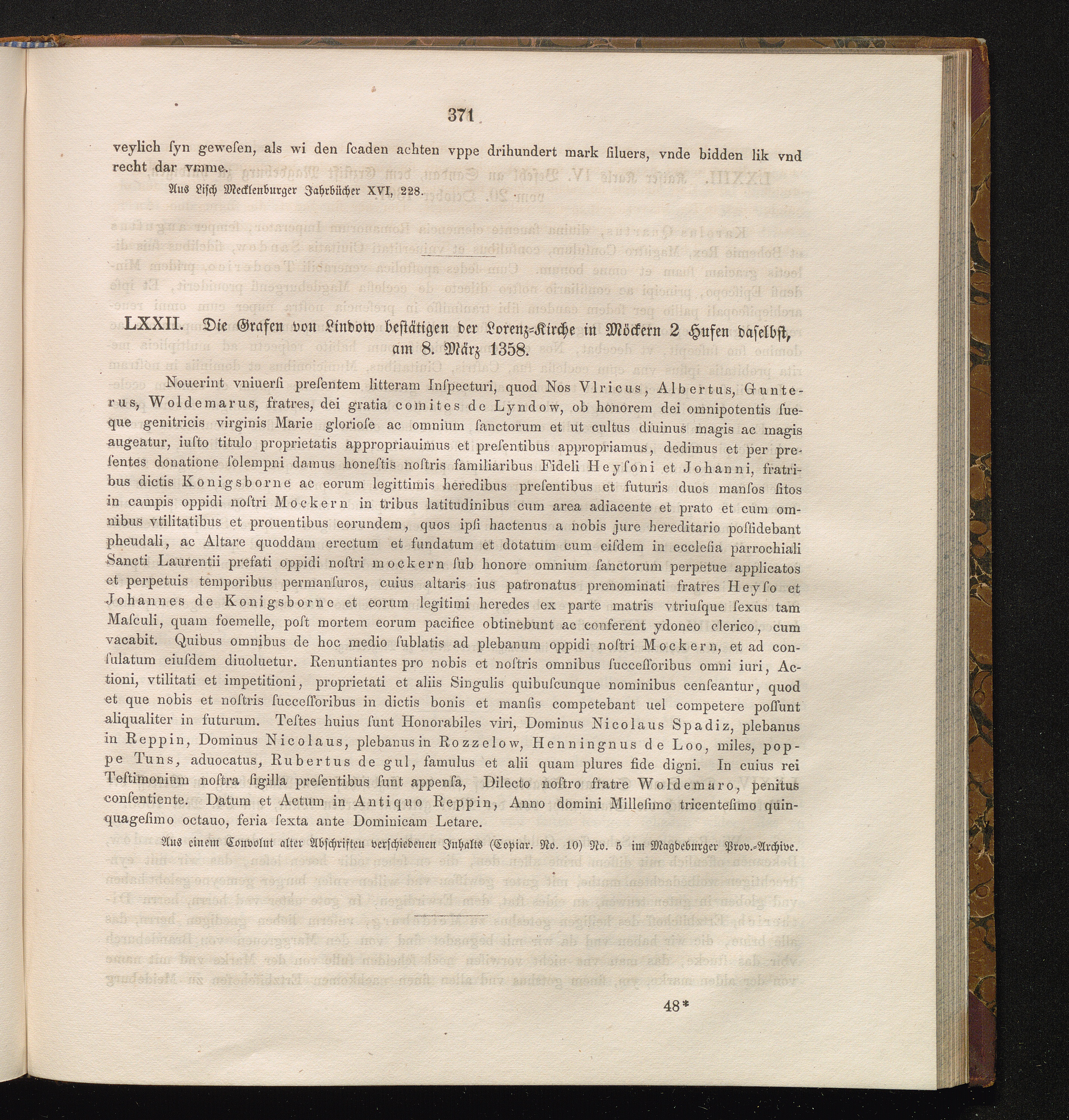 LXXII. Die Grafen von Lindow bestätigen der Lorenz-Kirche in Möckern 2 Hufen daselbst,[...]