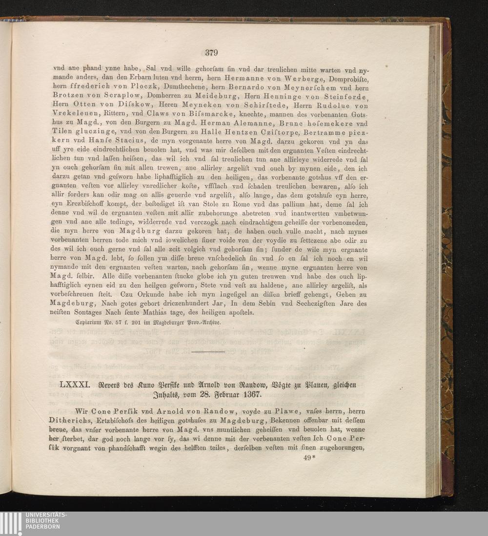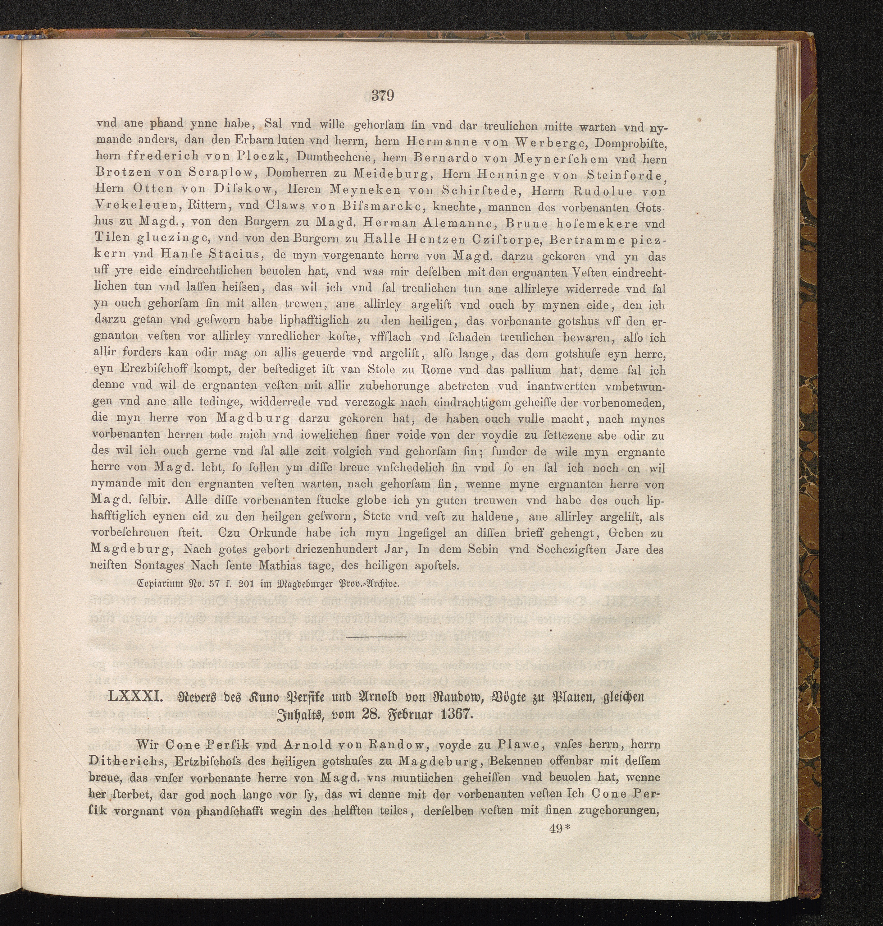 LXXXI. Revers des Kuno Persike und Arnold von Raudow, Vögte zu Plauen, gleichen Jnhalts,[...]