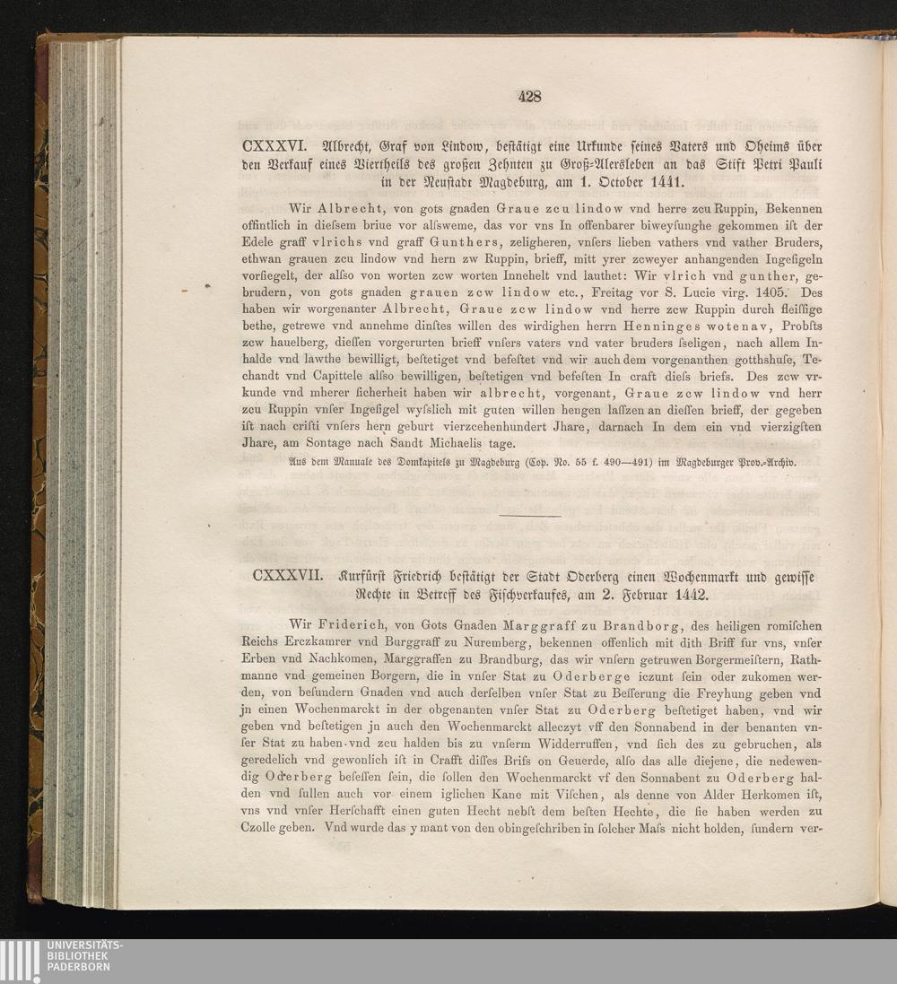 CXXXVII. Kurfürst Friedrich bestätigt der Stadt Oderberg einen Wochenmarkt und gewisse[...]