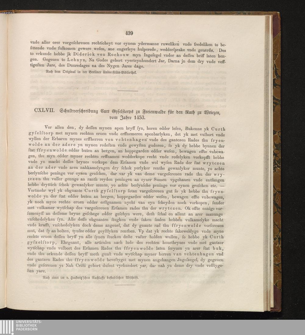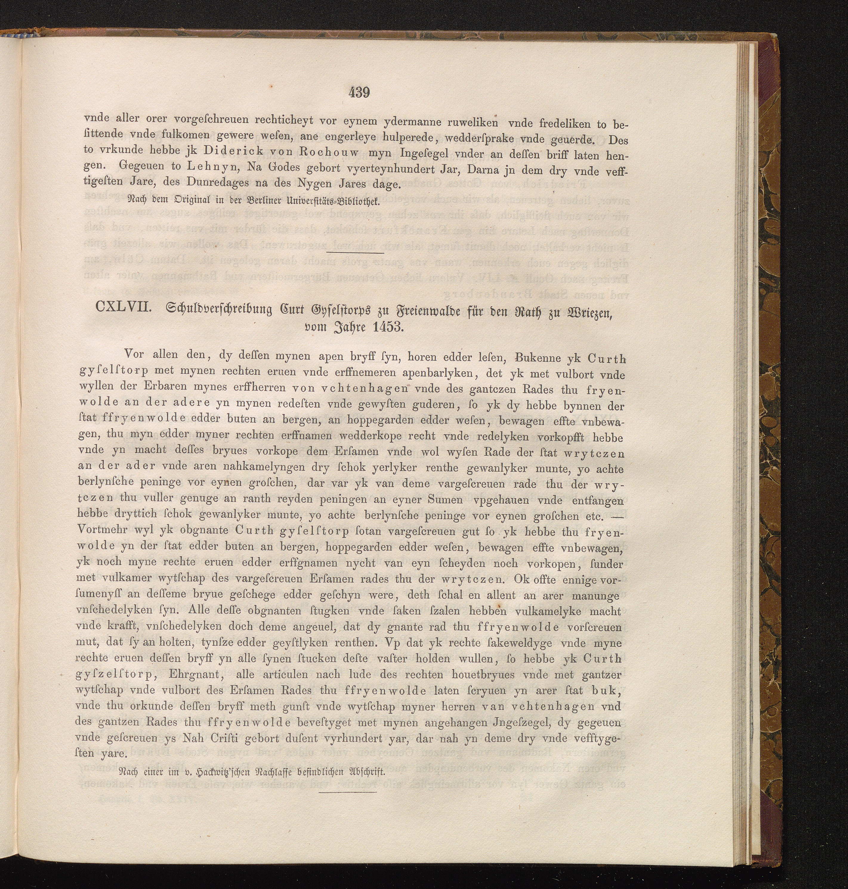 CXLVII. Schuldverschreibung Curt Gyselstorps zu Freienwalde für den Rath zu Wriezen,[...]