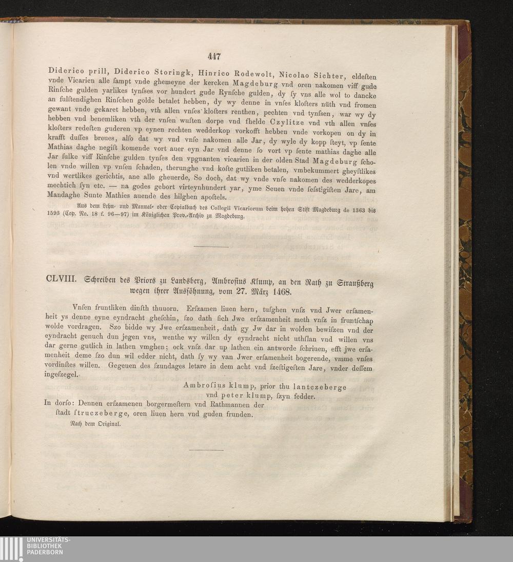 CLVIII. Schreiben des Priors zu Landsberg, Ambrosius Klump, an den Rath zu Straußberg[...]