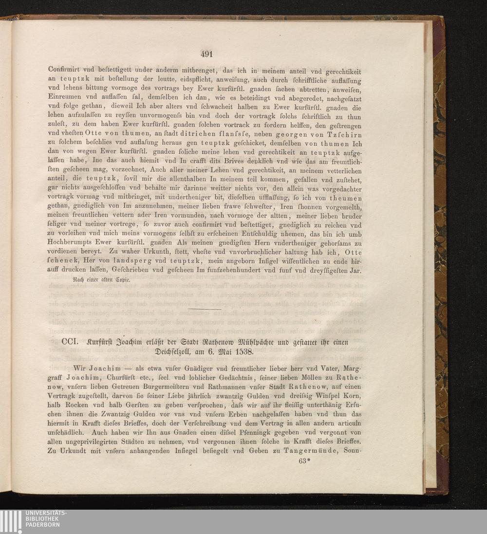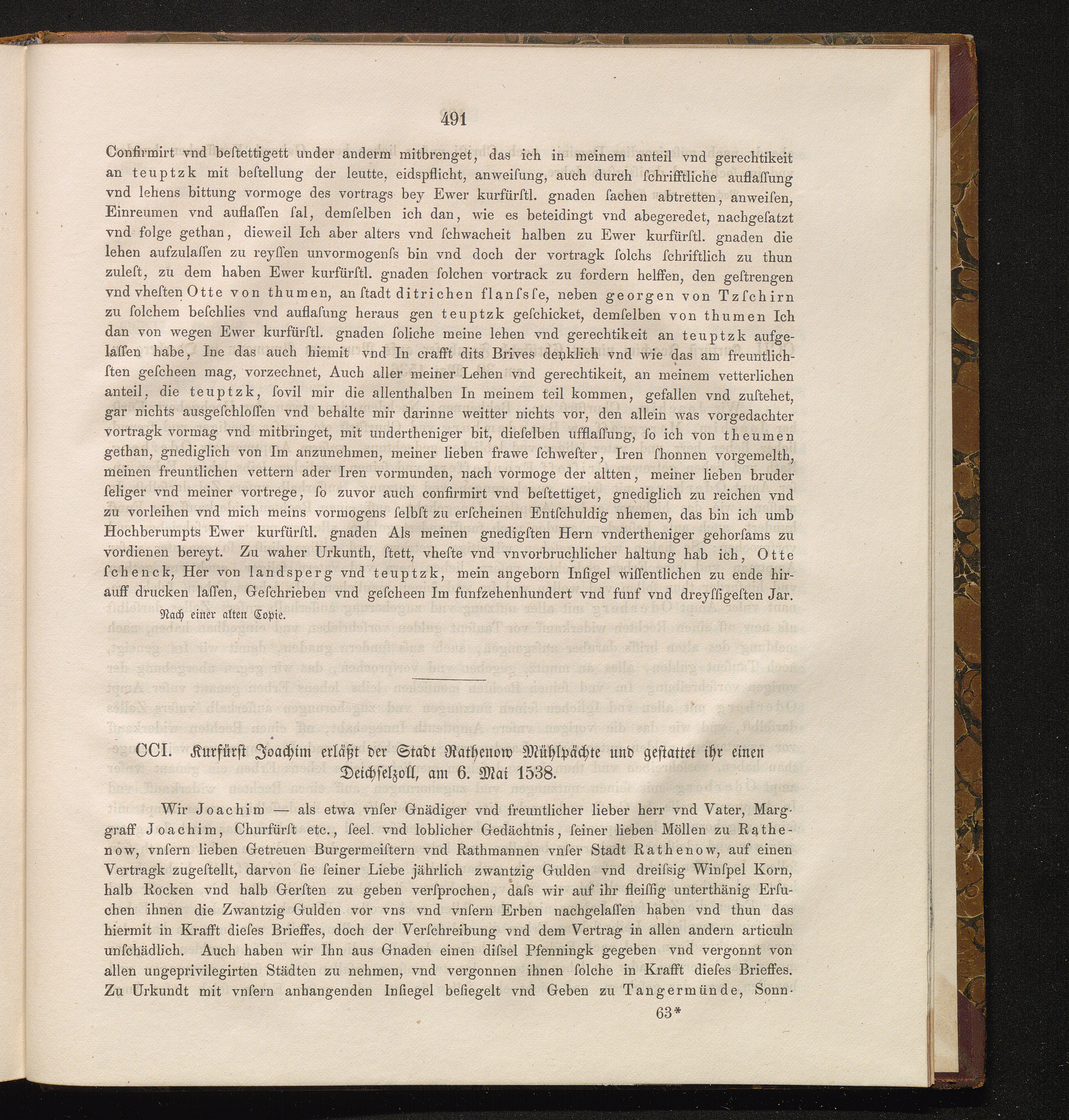 CCI. Kurfürst Joachim erläßt der Stadt Rathenow Mühlpächte und gestattet ihr einen[...]