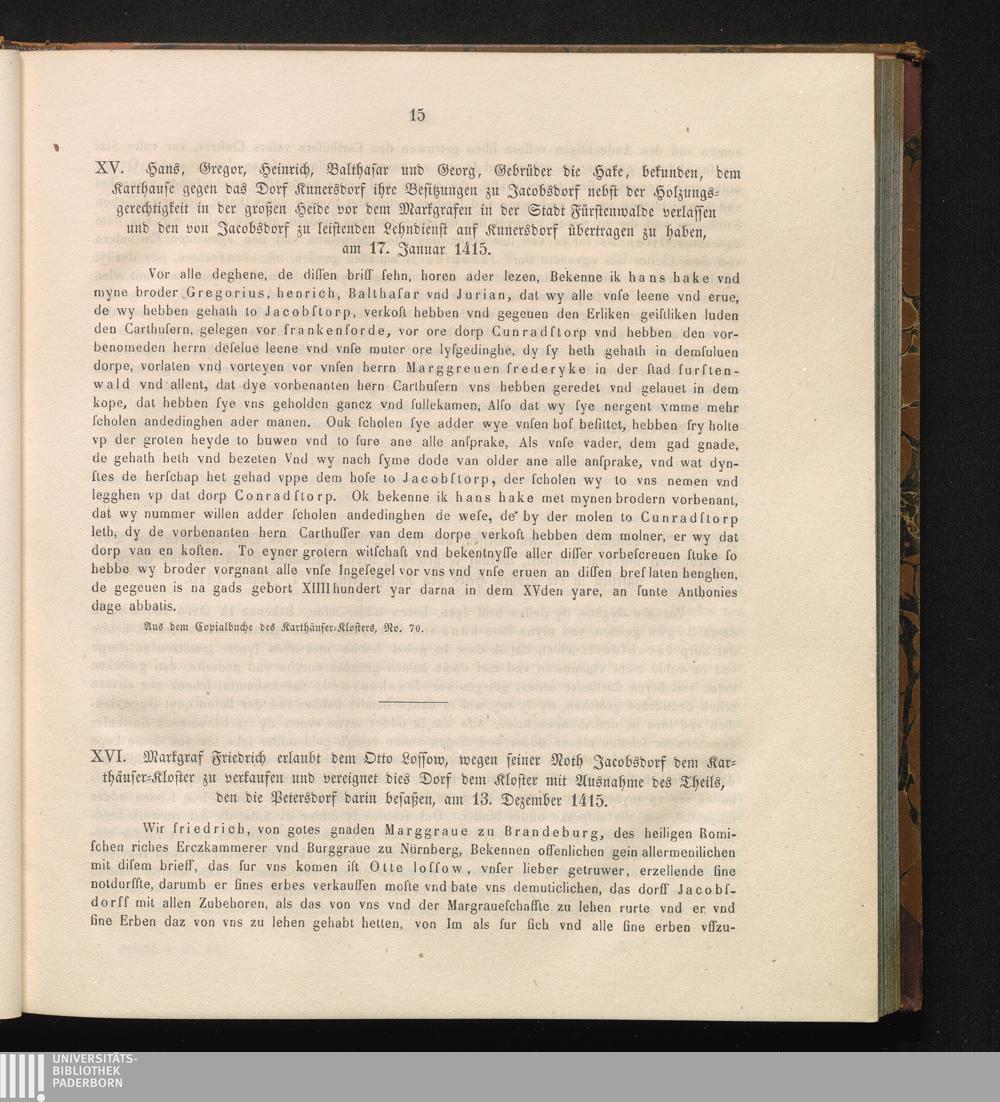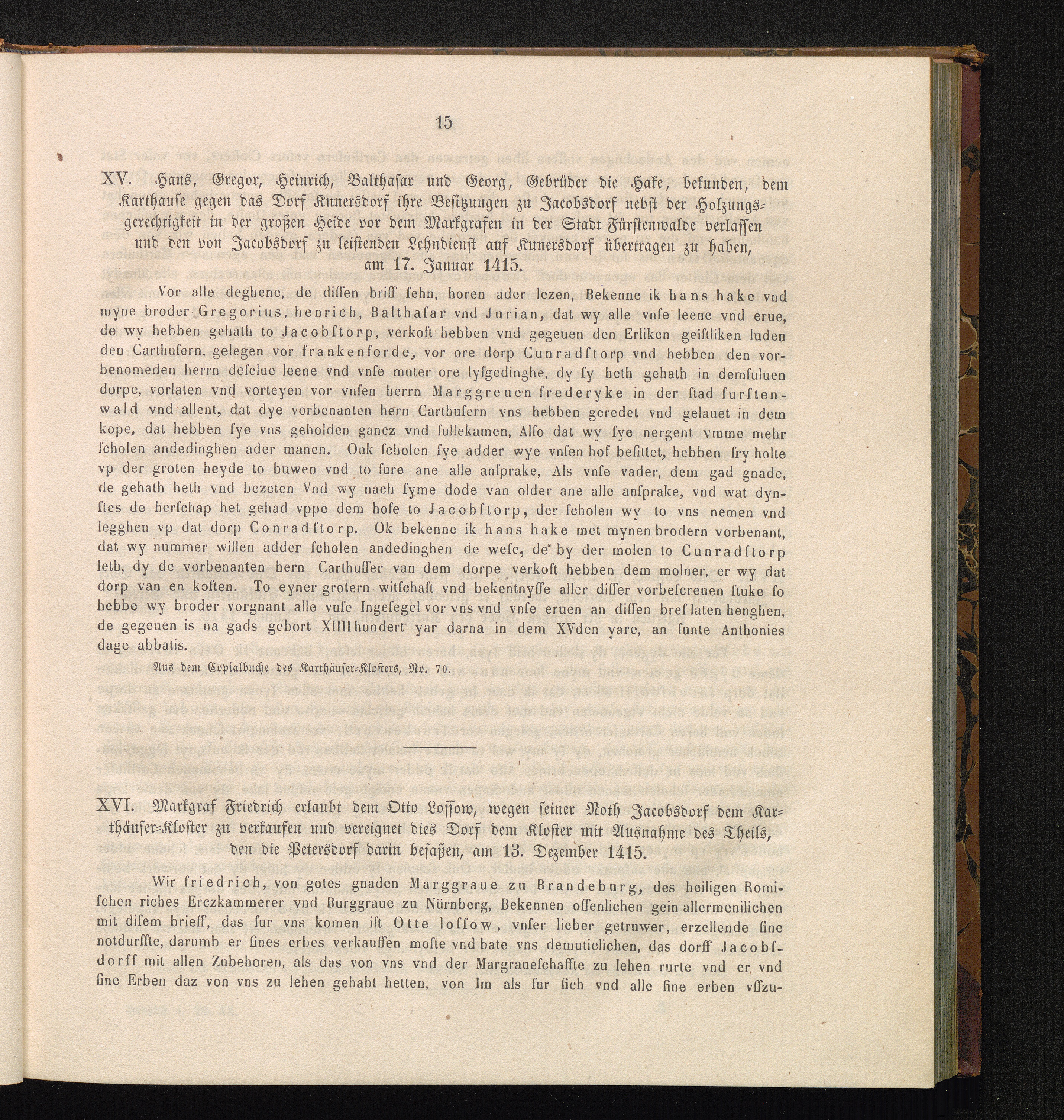 XVI. Markgraf Friedrich erlaubt dem Otto Lossow, wegen seiner Noth Jacobsdorf dem[...]