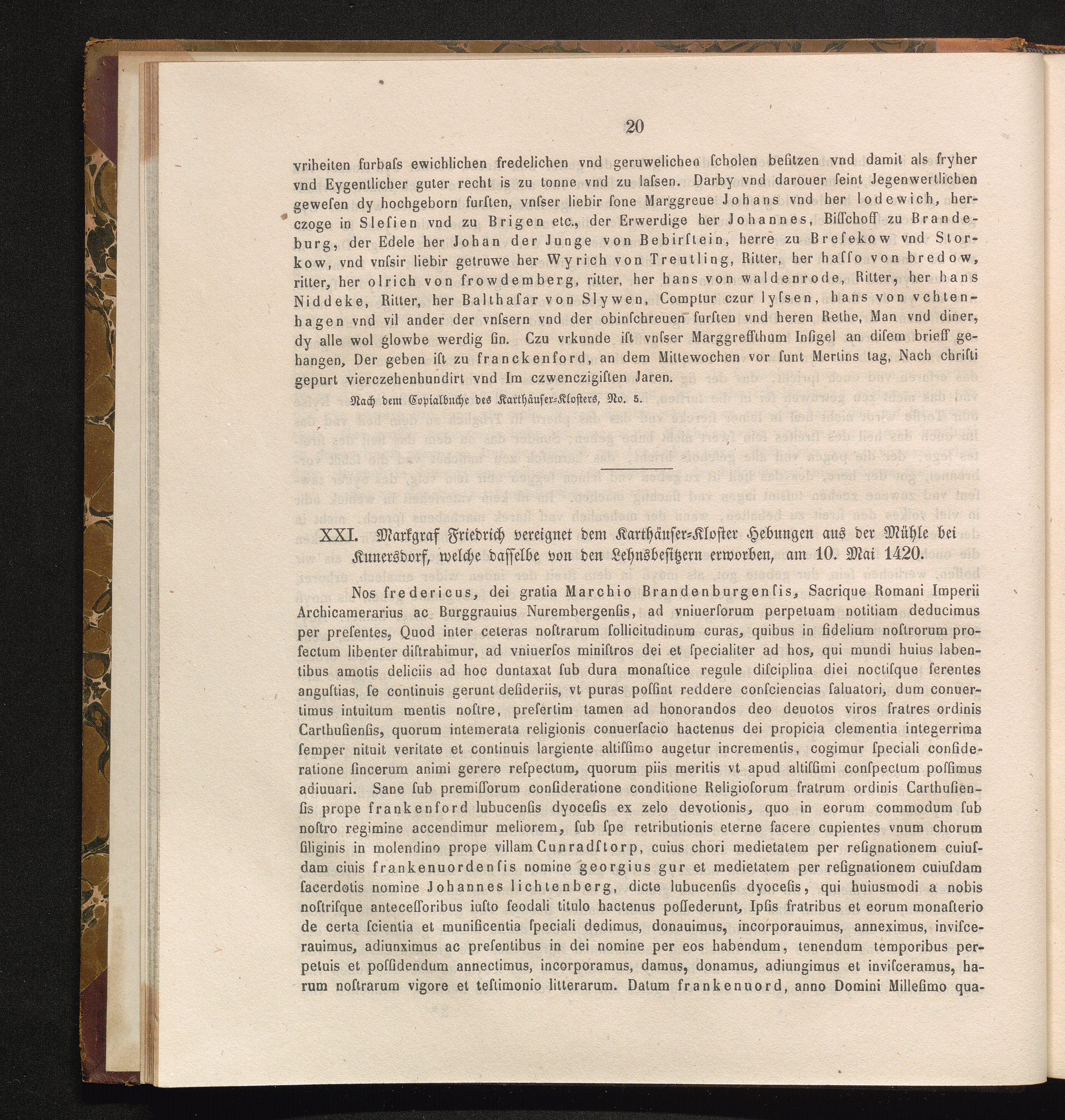 XXI. Markgraf Friedrich vereignet dem Karthäuser-Kloster Hebungen aus der Mühle bei[...]