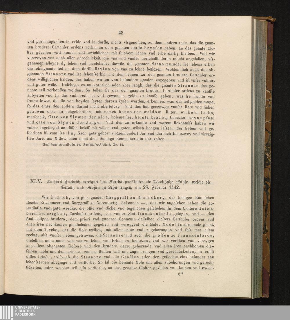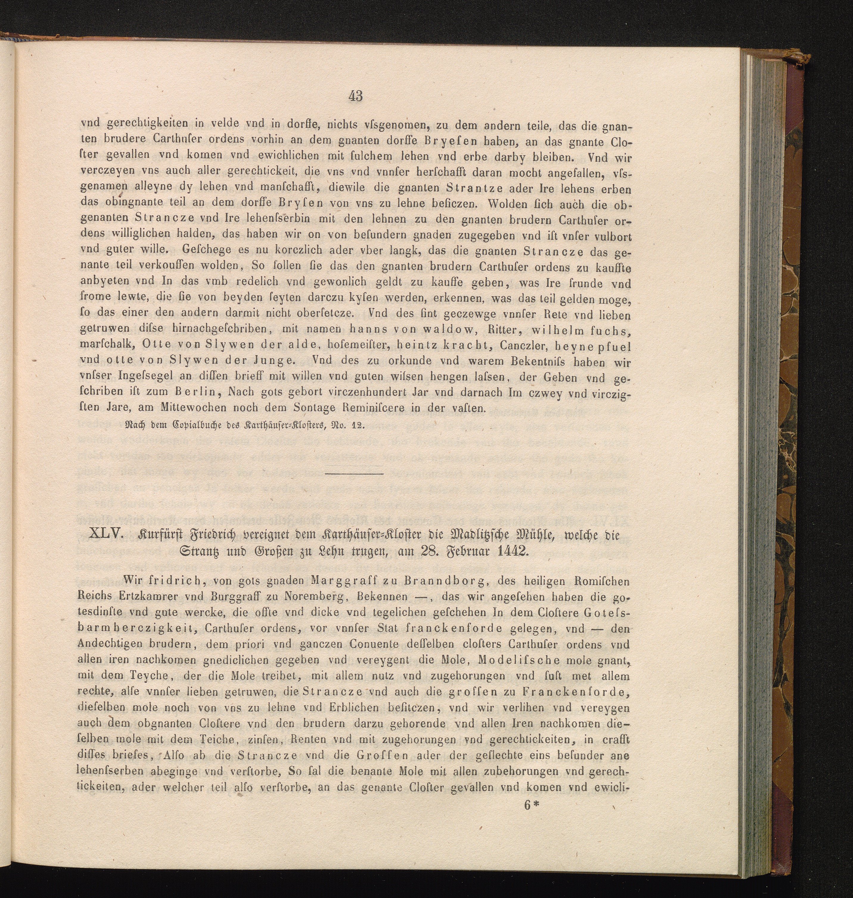 XLV. Kurfürst Friedrich vereignet dem Karthäuser-Kloster die Madlitzsche Mühle, welche[...]