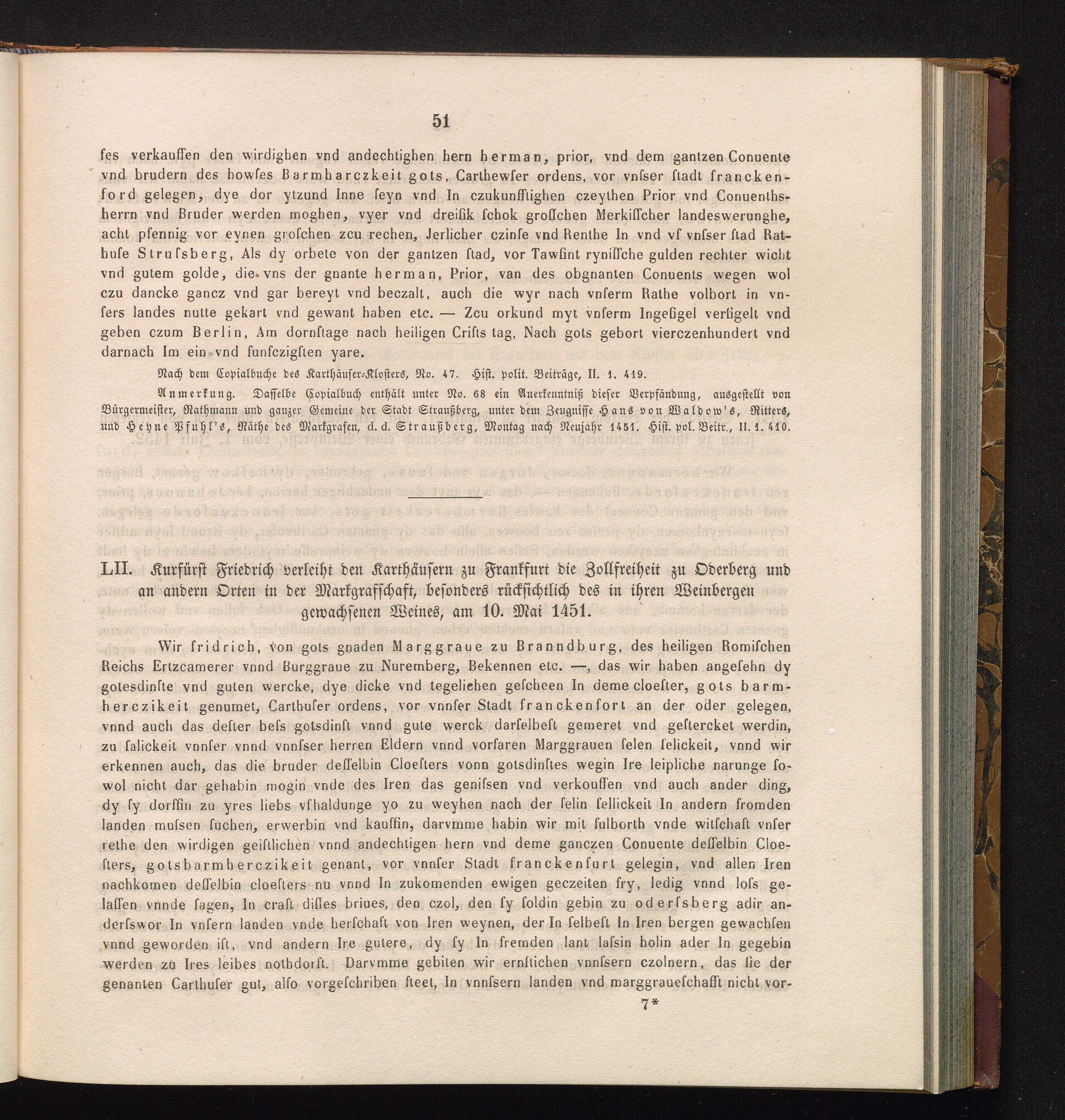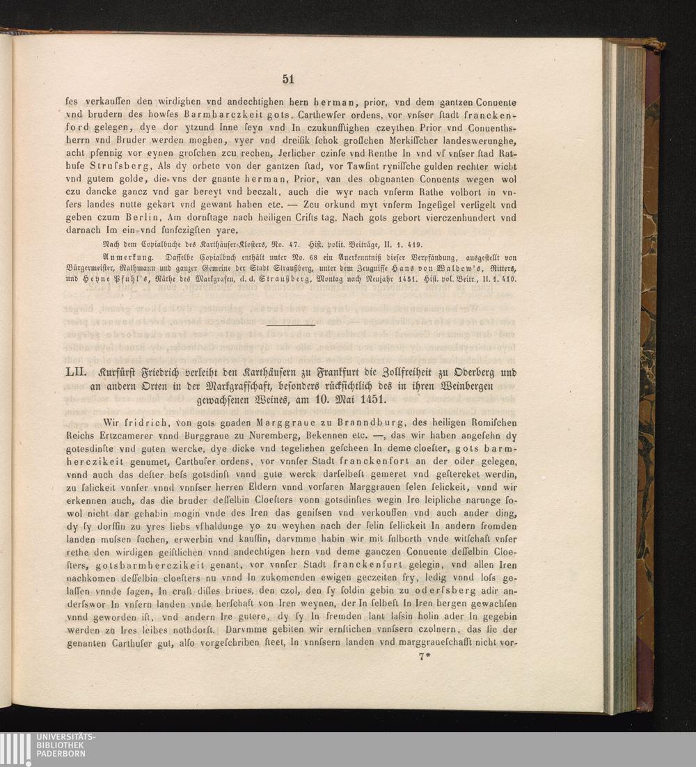 LII. Kurfürst Friedrich verleiht den Karthäusern zu Frankfurt die Zollfreiheit zu[...]