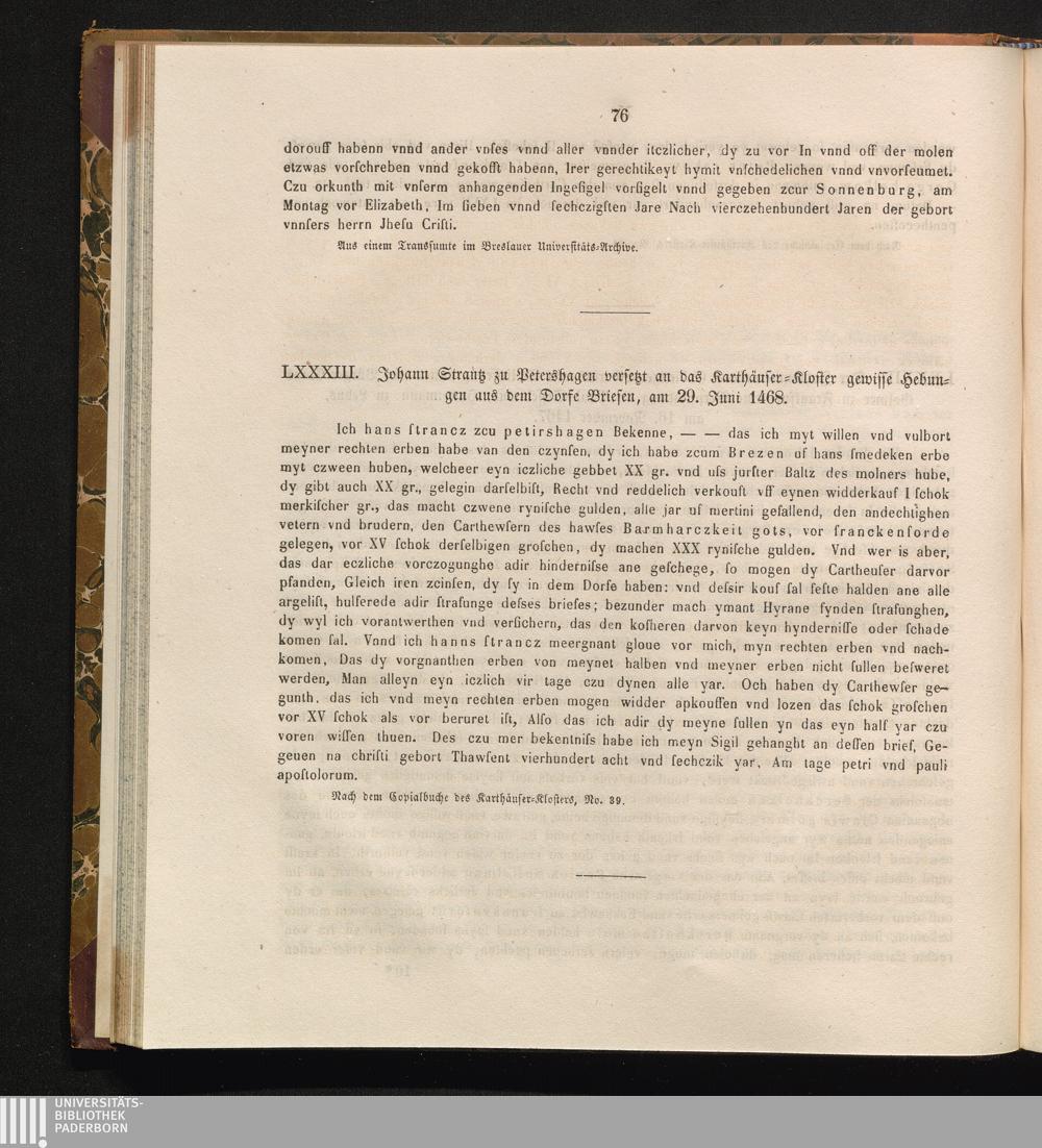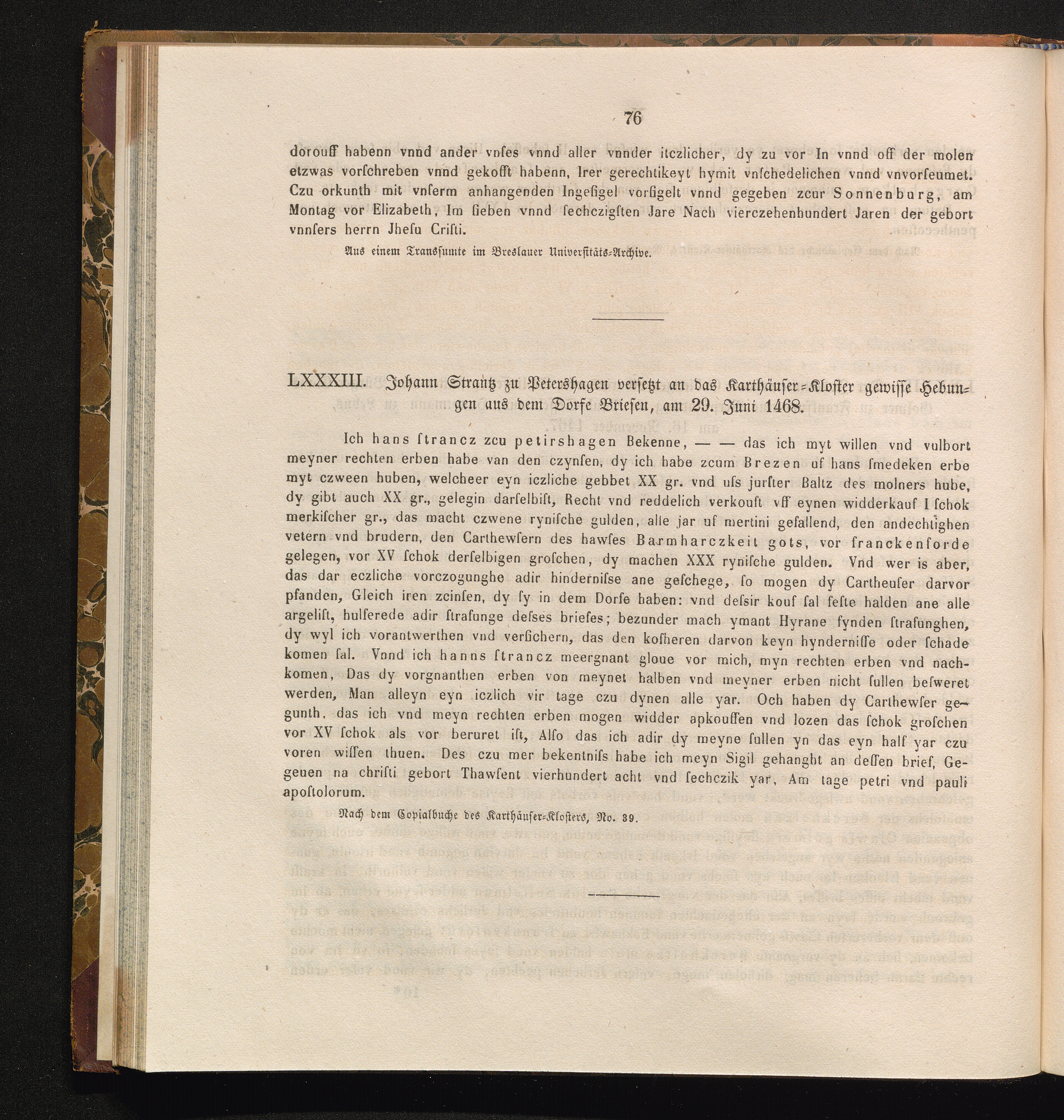 LXXXIII. Johann Strantz zu Petershagen versetzt an das Karthäuser-Kloster gewisse[...]