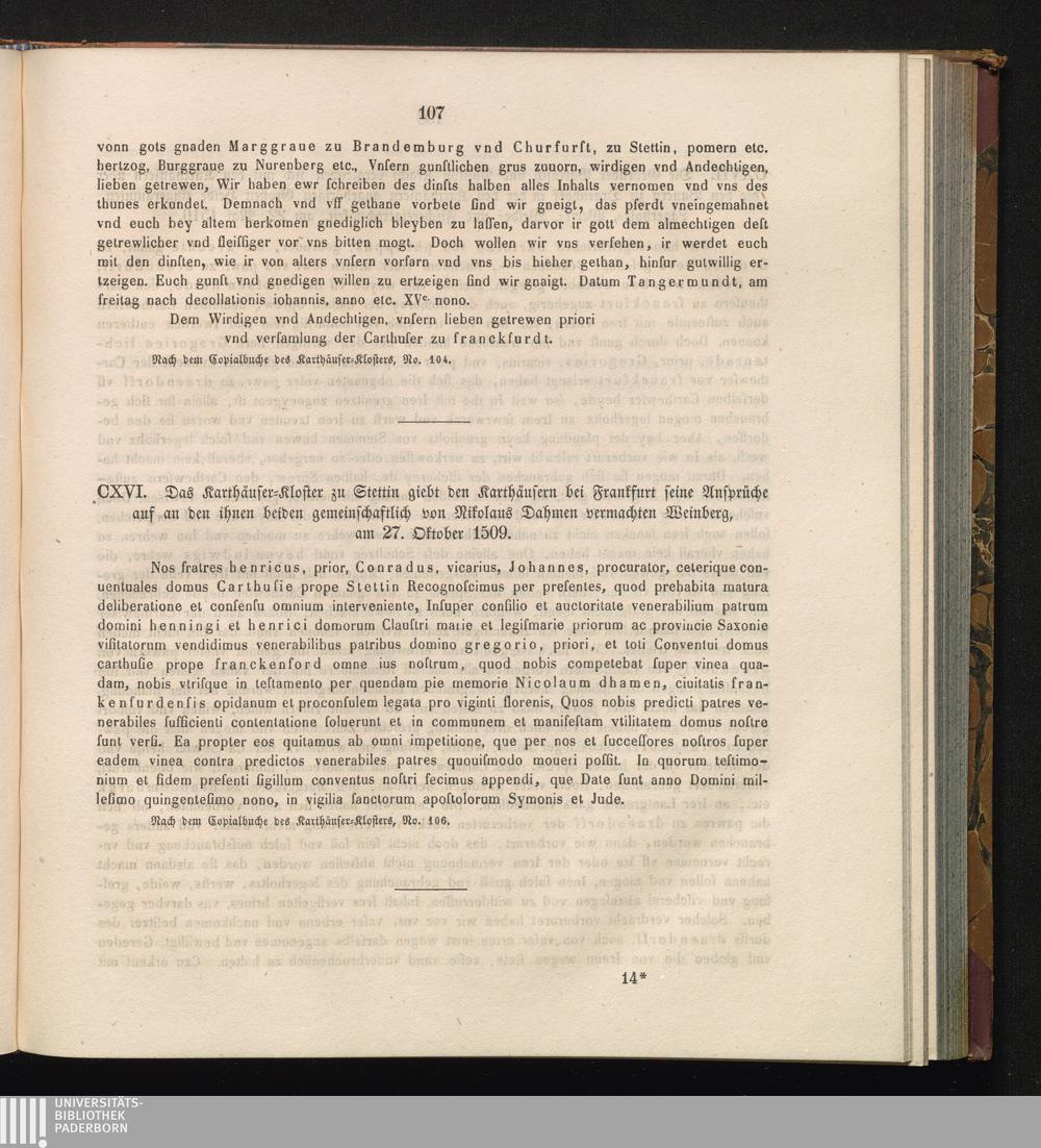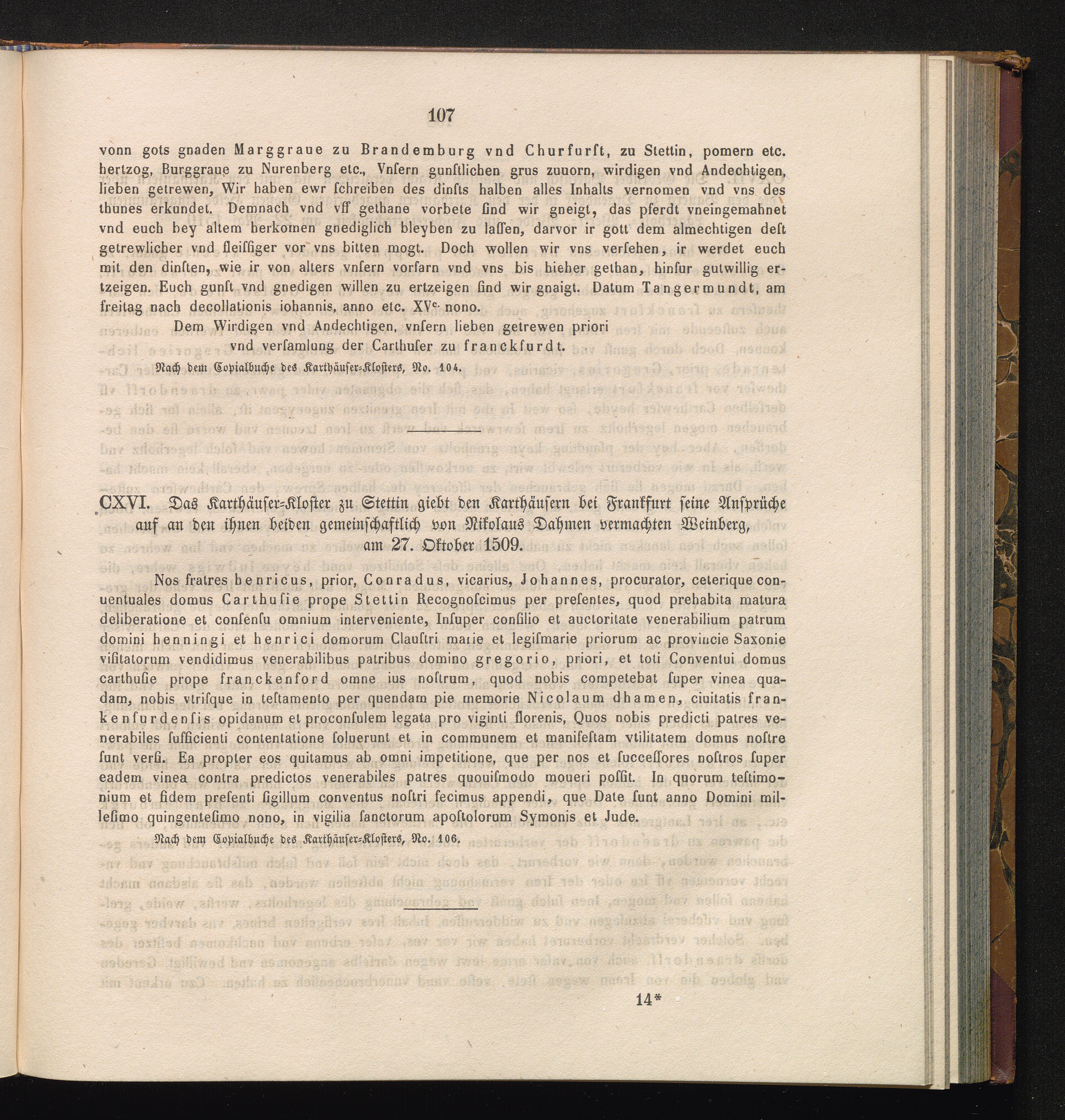CXVI. Das Karthäuser-Kloster zu Stettin giebt den Karthäusern bei Frankfurt seine[...]