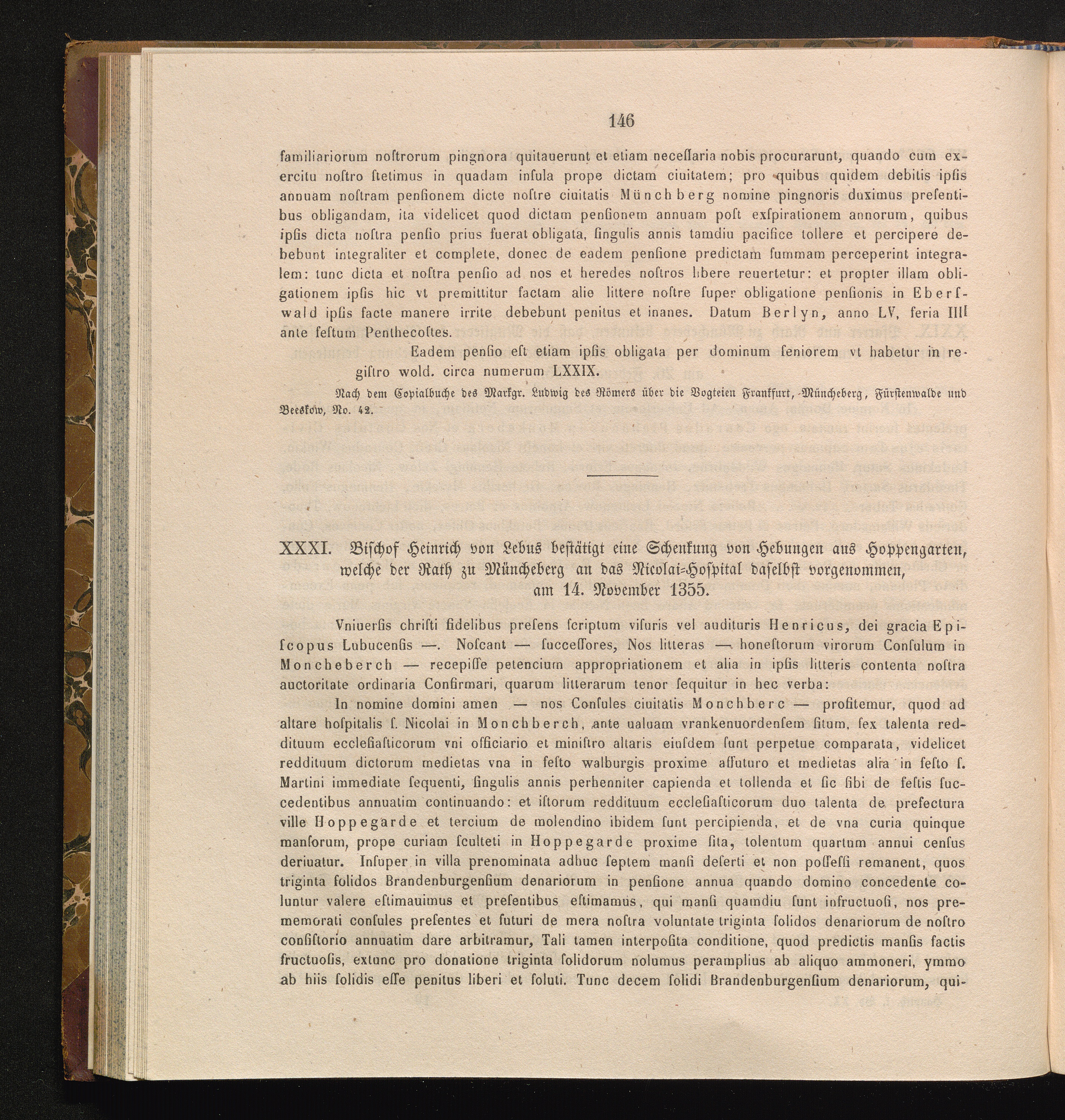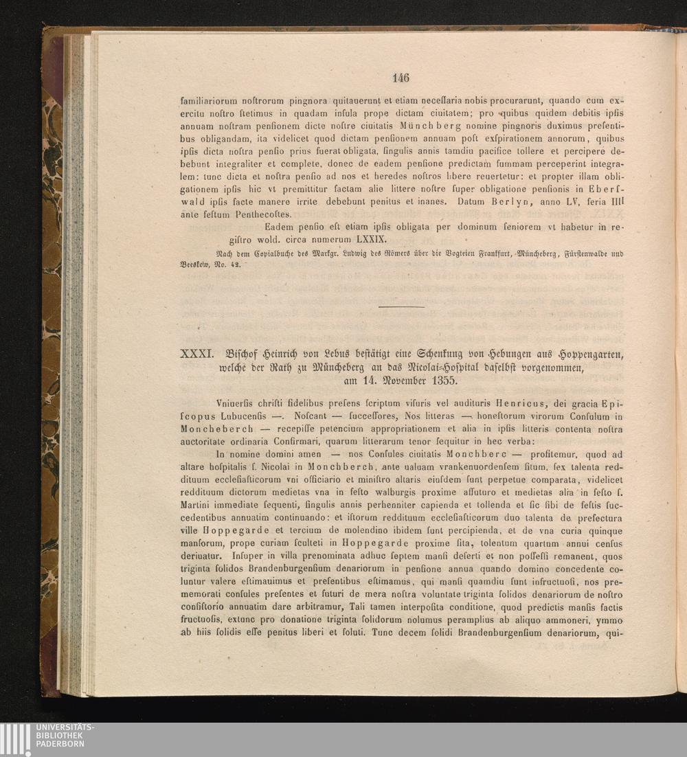 XXXI. Bischof Heinrich von Lebus bestätigt eine Schenkung von Hebungen aus Hoppengarten,[...]