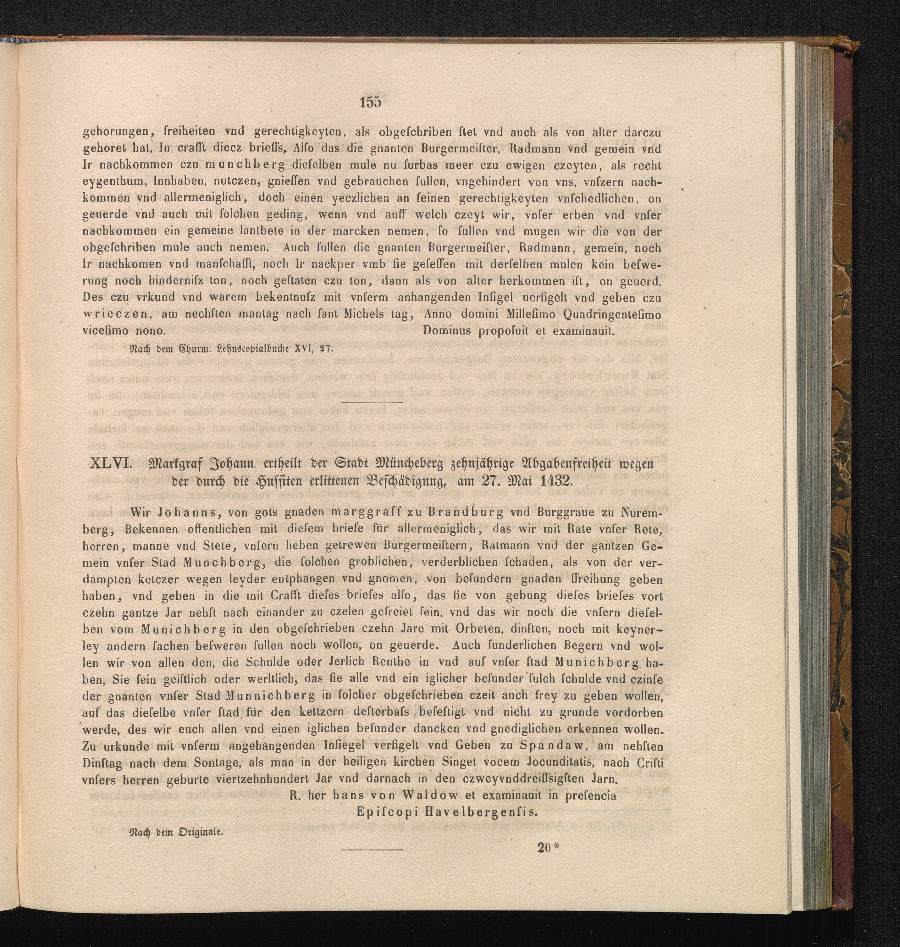 XLVI. Markgraf Johann ertheilt der Stadt Müncheberg zehnjährige Abgabenfreiheit wegen[...]