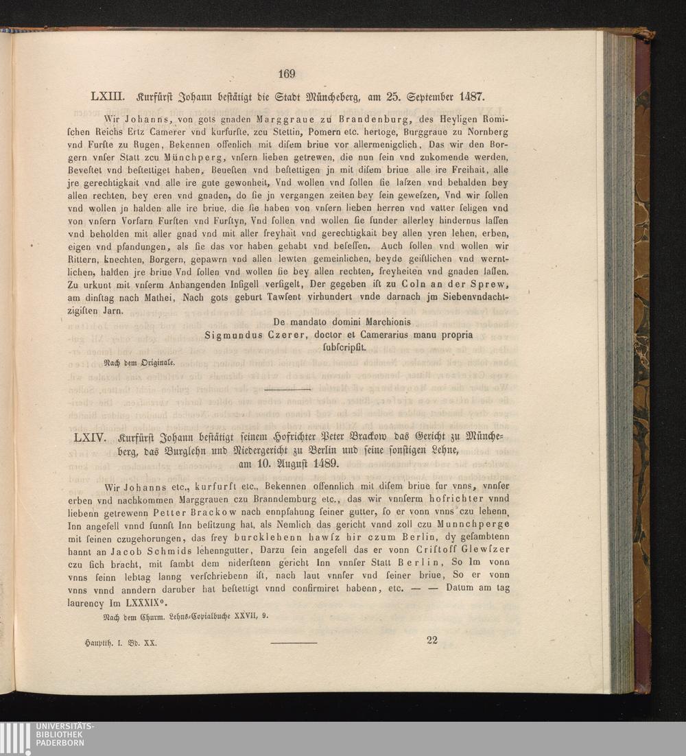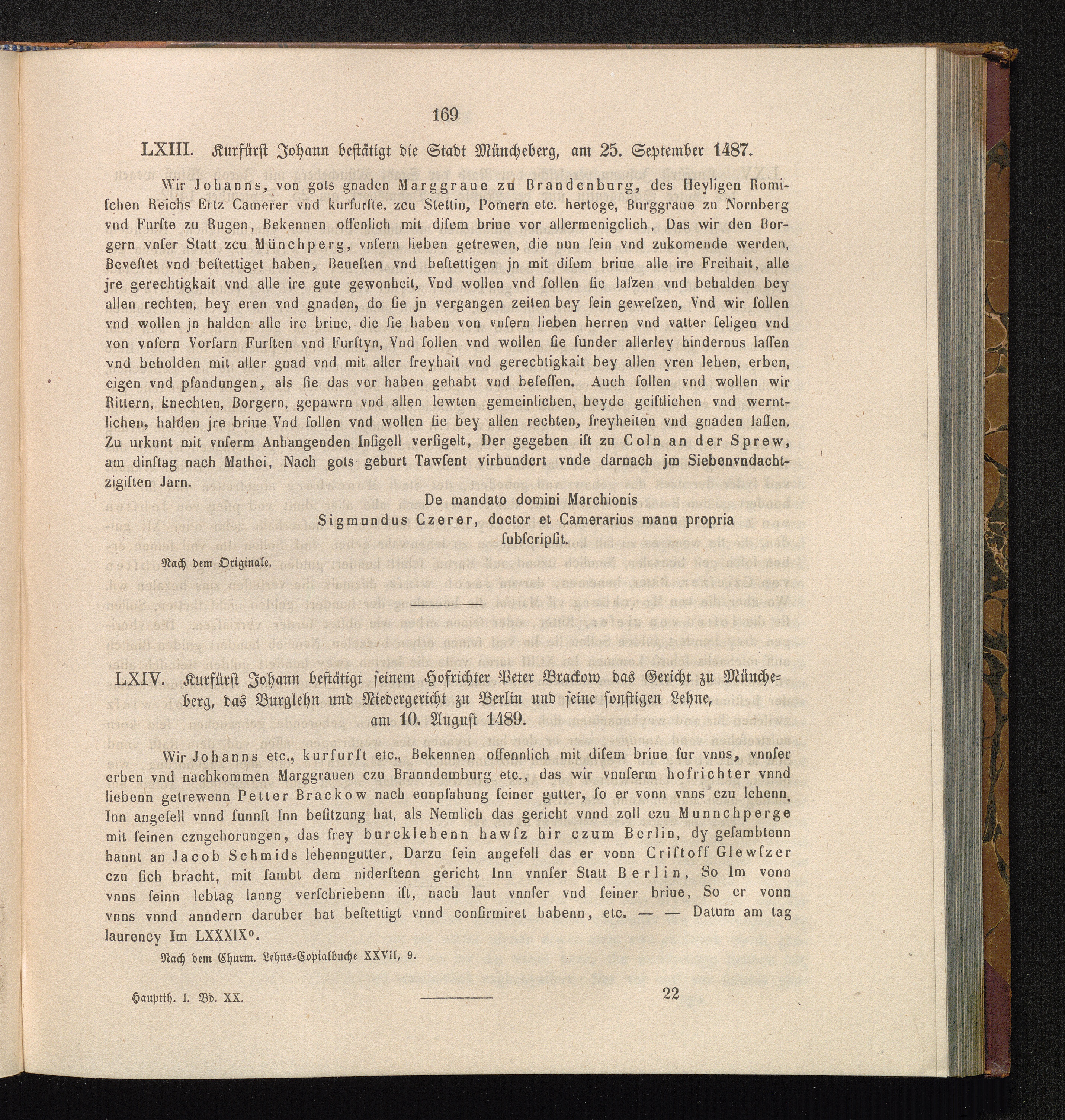 LXIV. Kurfürst Johann bestätigt seinem Hofrichter Peter Brackow das Gericht zu Müncheberg,[...]