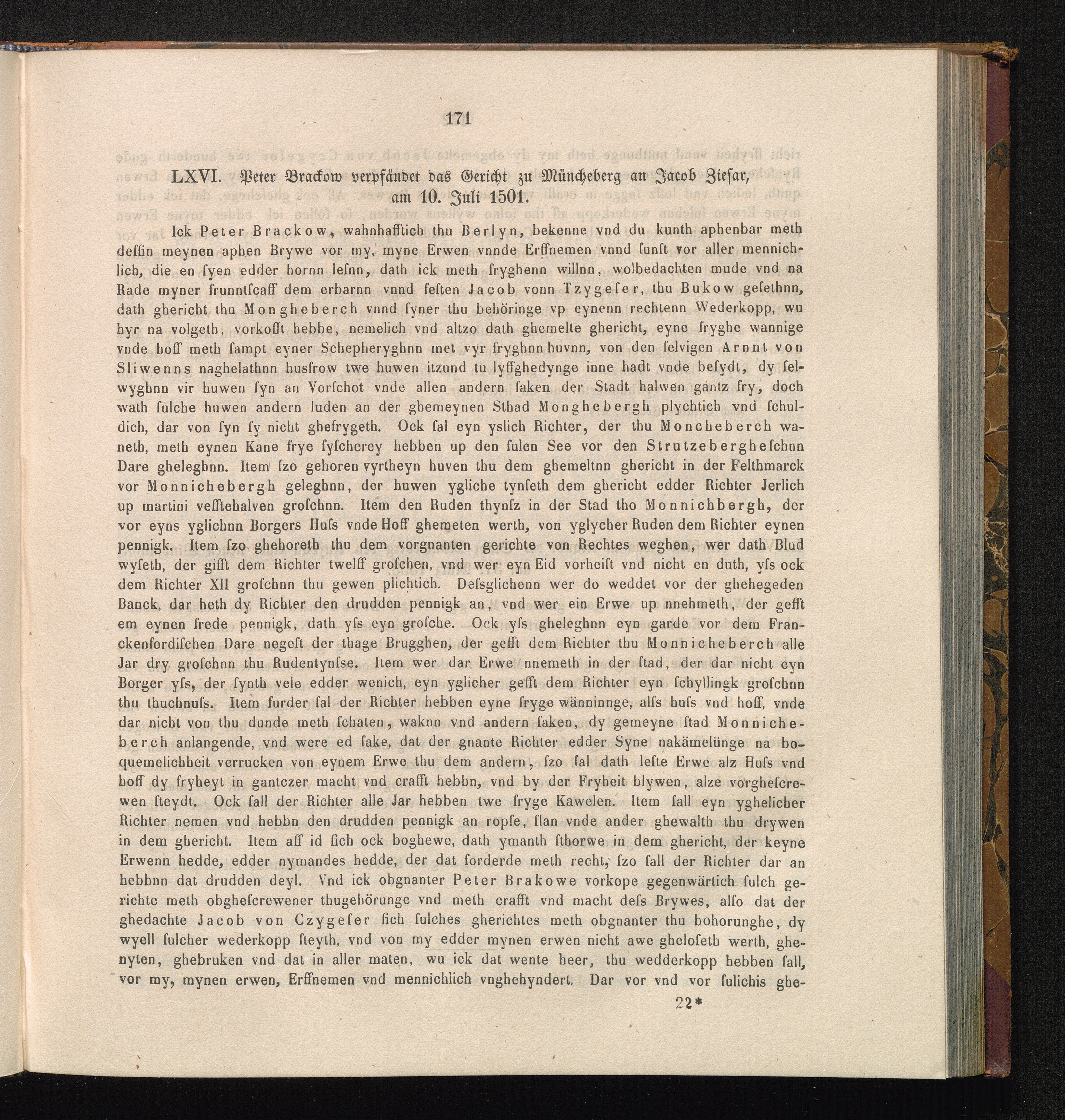 LXVI. Peter Brackow verpfändet das Gericht zu Müncheberg an Jacob Ziesar, am 10.[...]