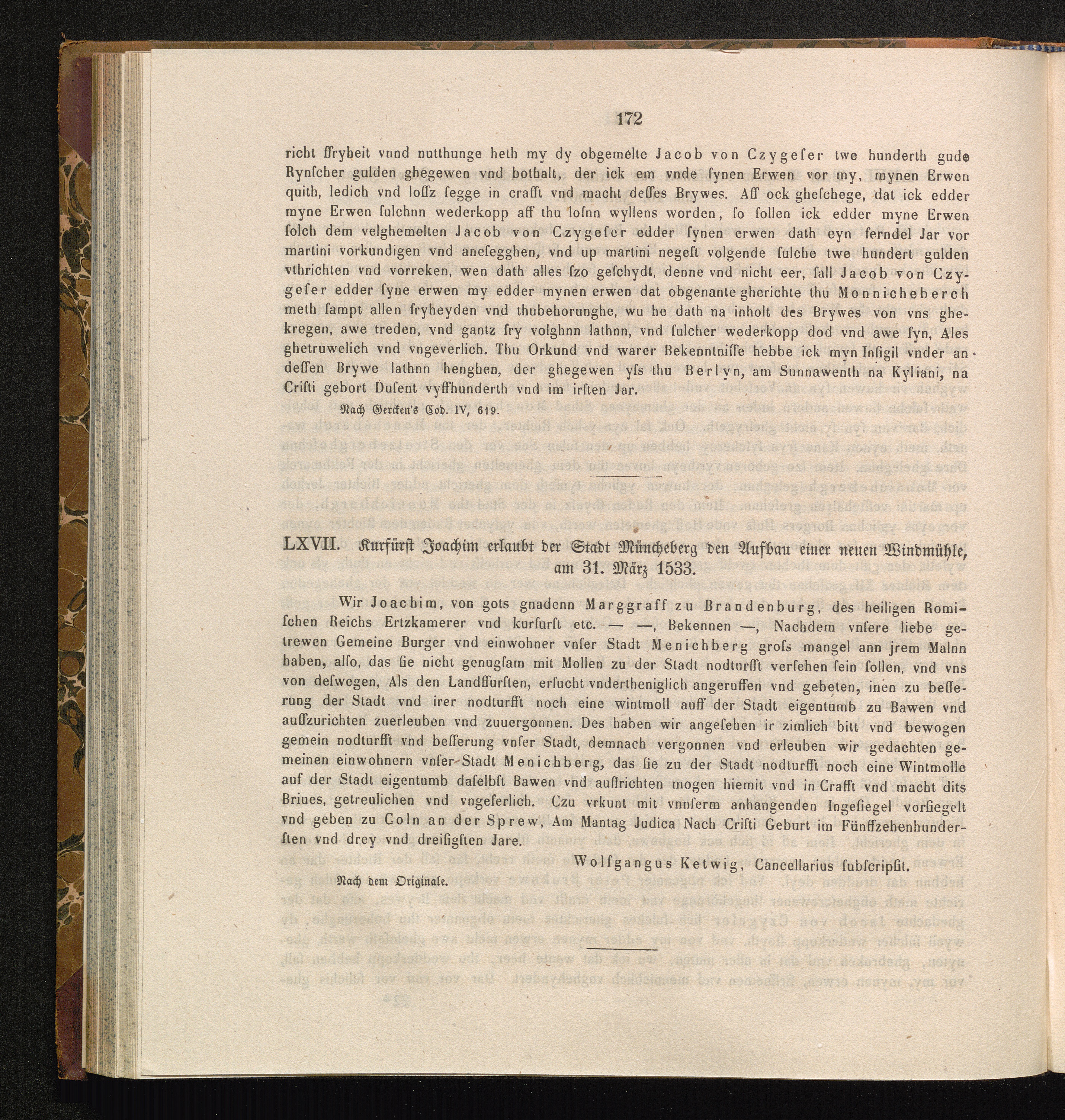 LXVII. Kurfürst Joachim erlaubt der Stadt Müncheberg den Aufbau einer neuen Windmühle,[...]