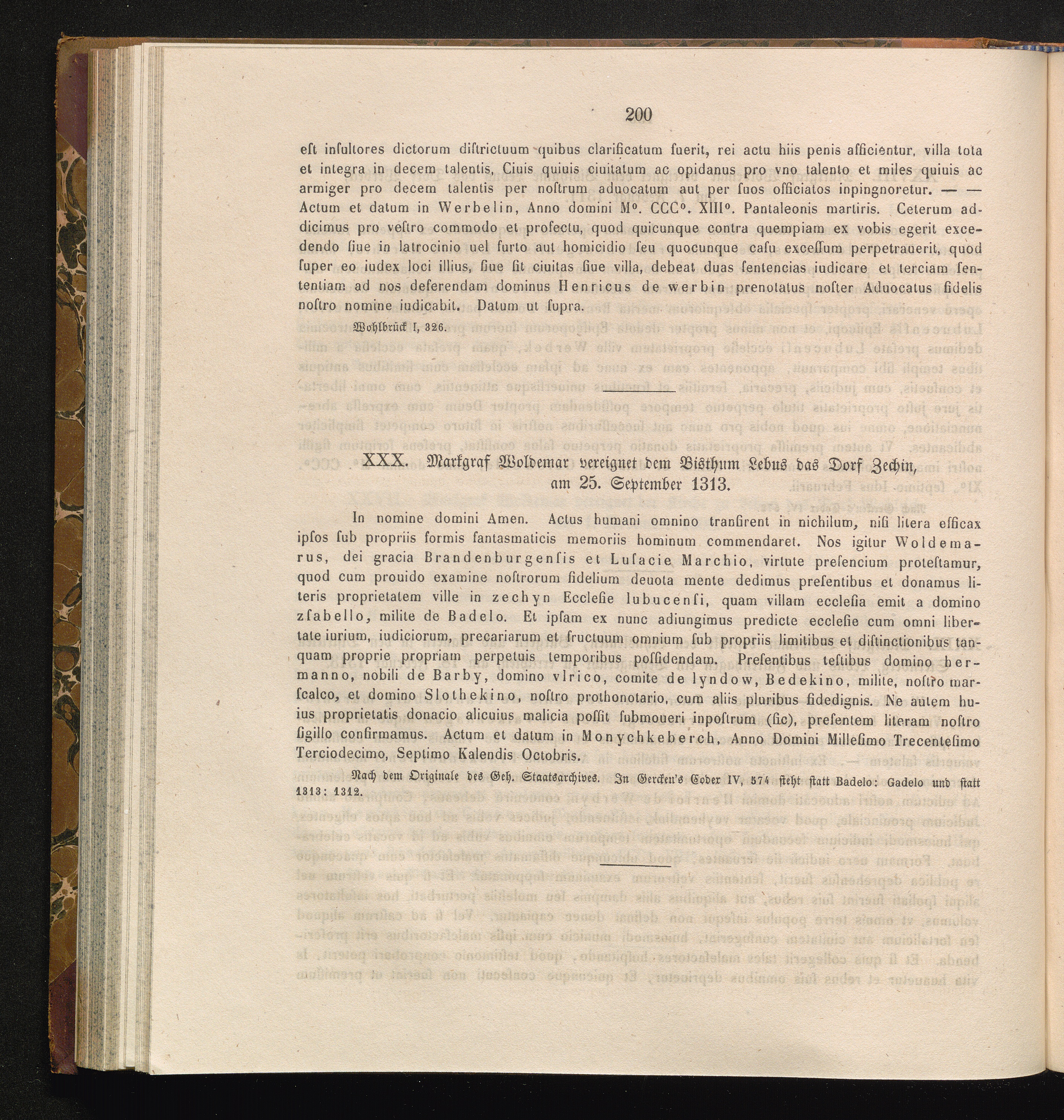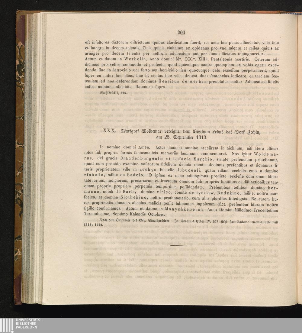 XXX. Markgraf Woldemar vereignet dem Bisthum Lebus das Dorf Zechin, am 25. September[...]