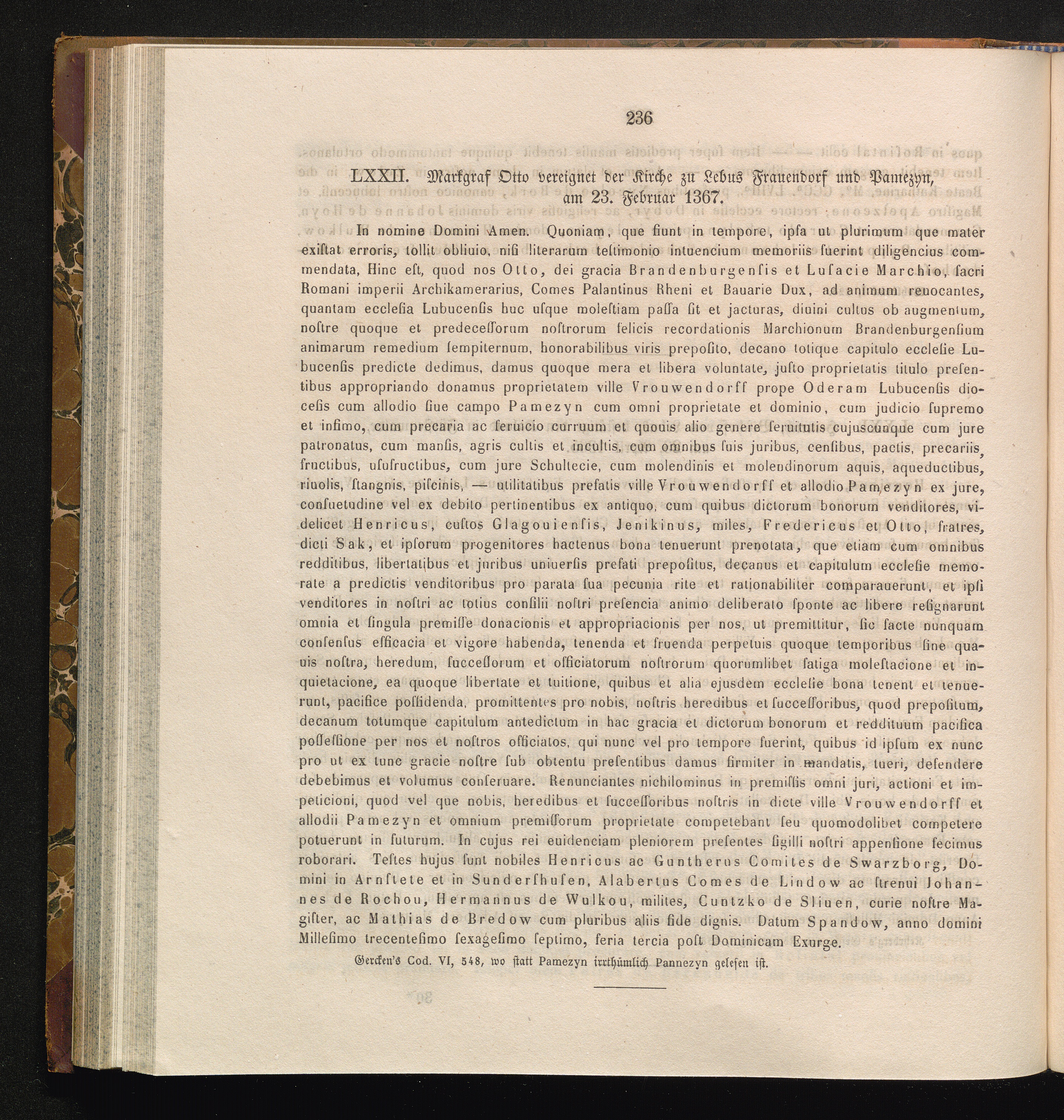 LXXII. Markgraf Otto vereignet der Kirche zu Lebus Frauendorf und Pamyzin, am 23.[...]