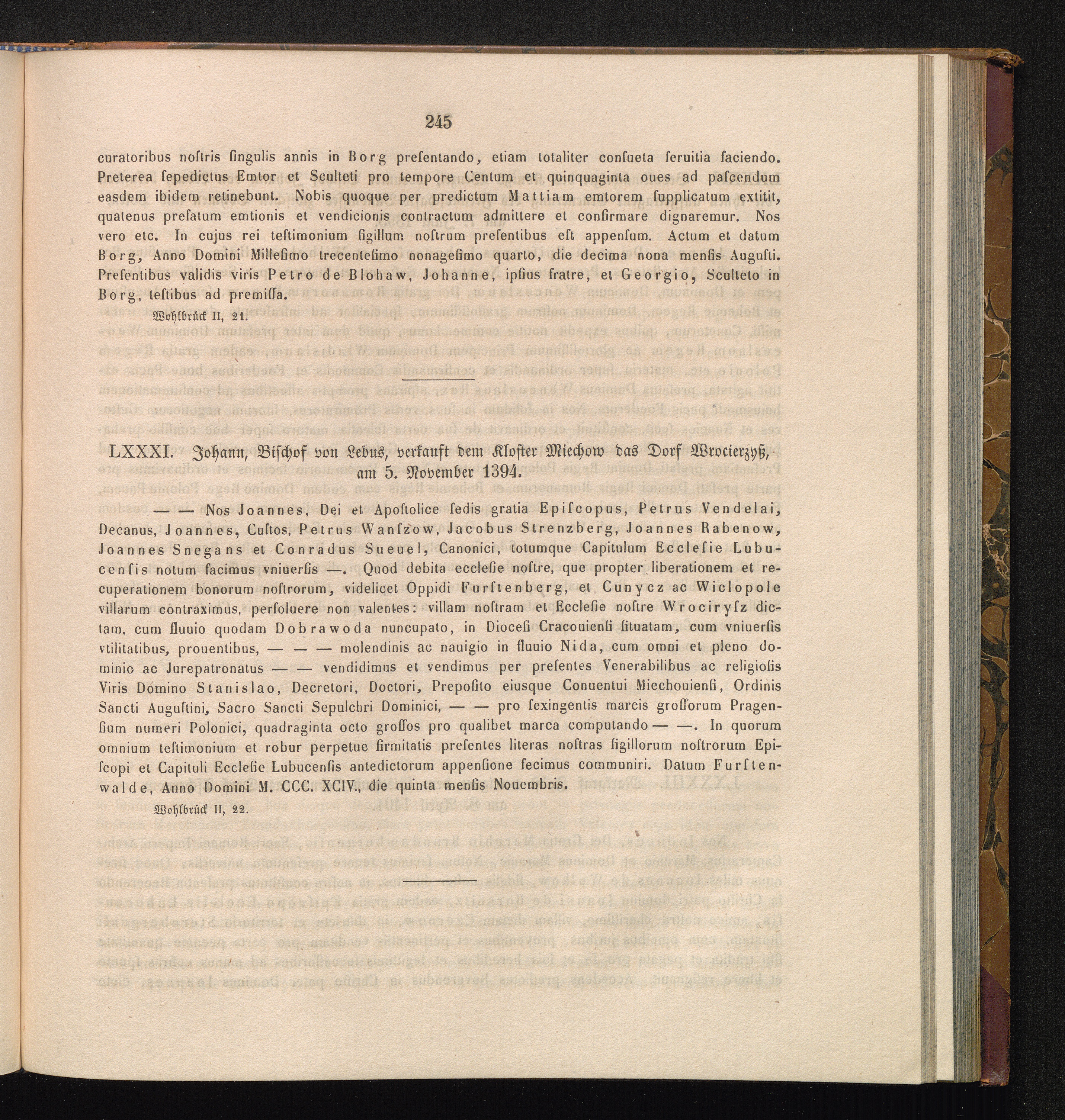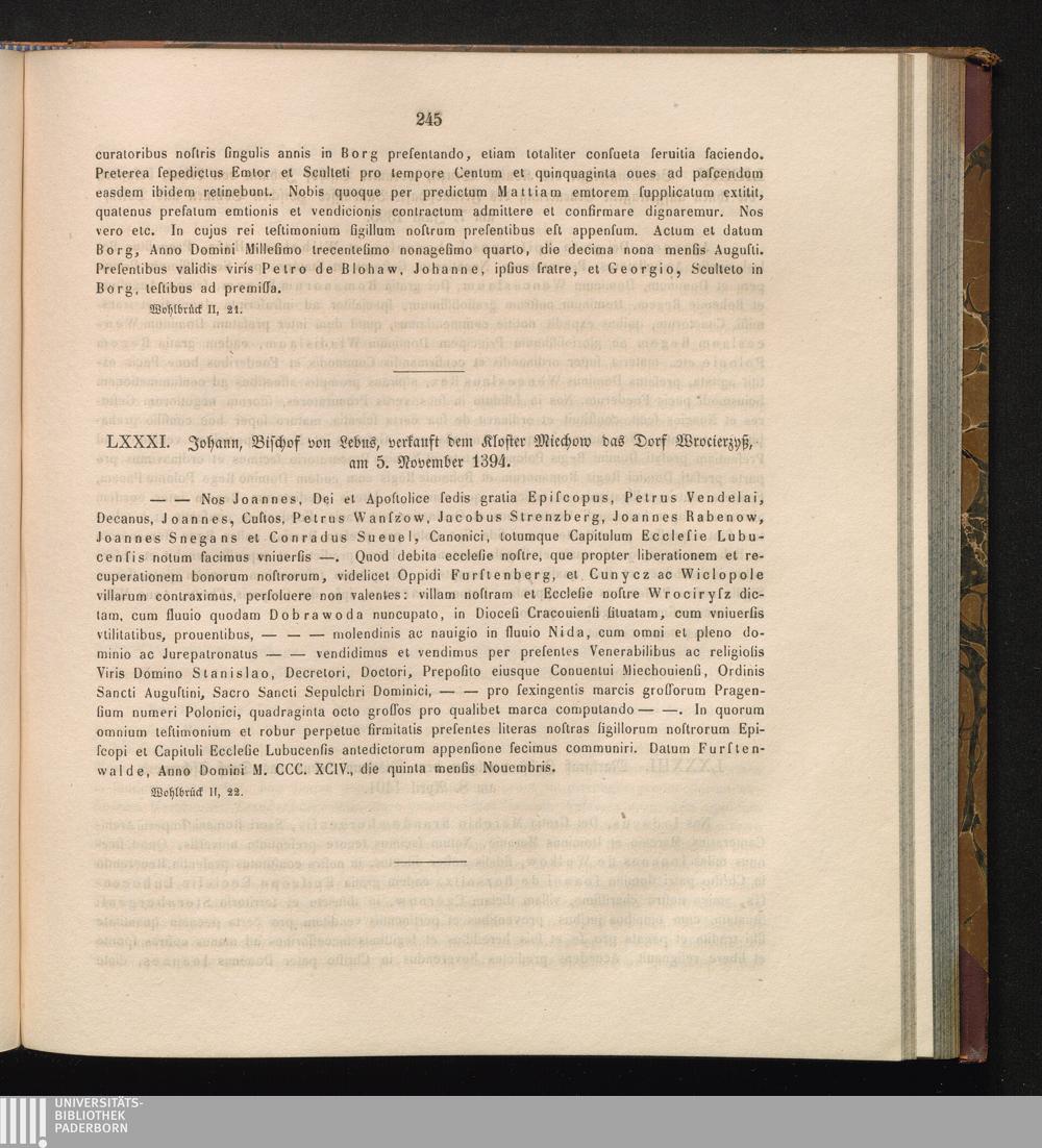 LXXXI. Johann, Bischof von Lebus, verkauft dem Kloster das Dorf Wrocierzyß, am 5.[...]