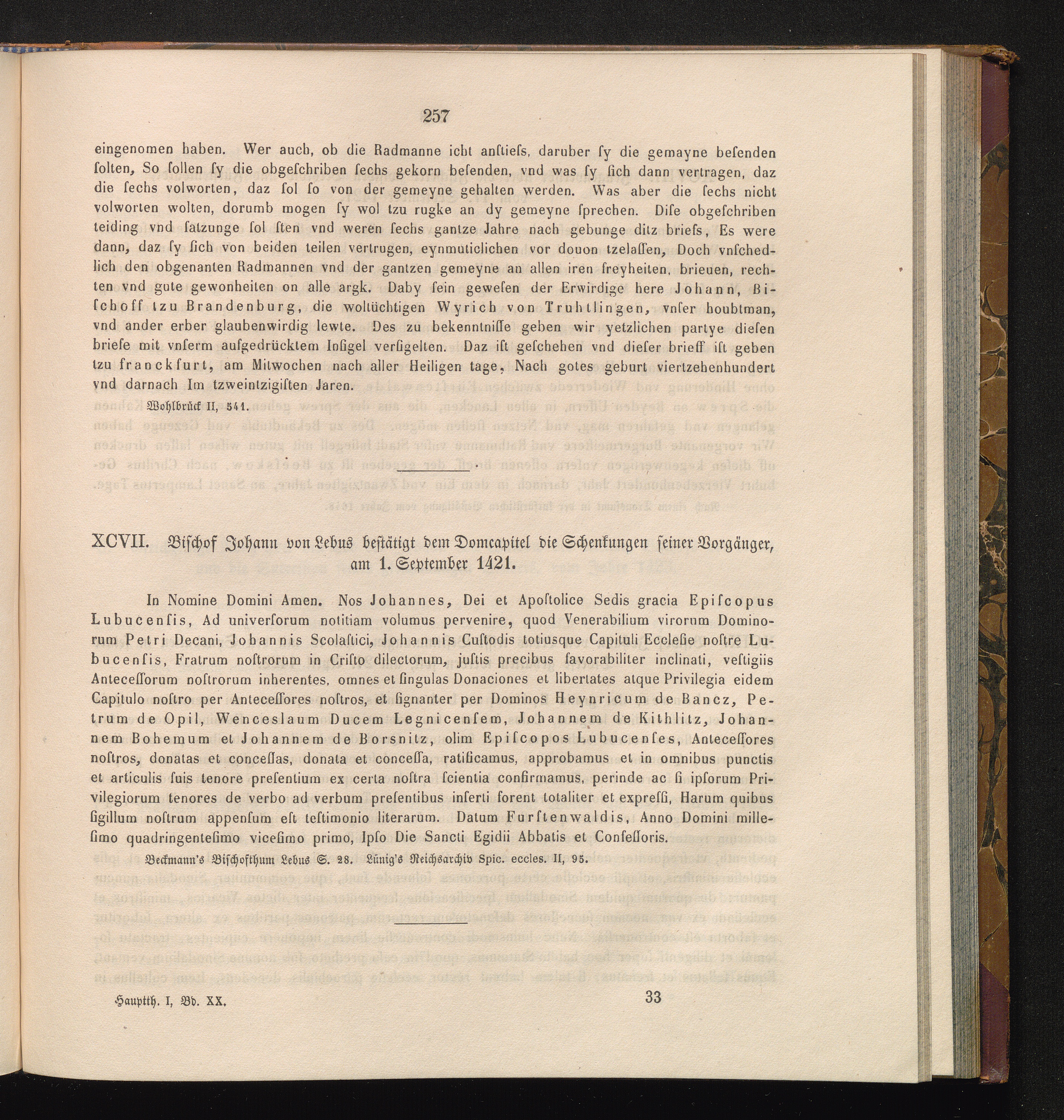 XCVII. Bischof Johann von Lebus bestätigt dem Domcapitel die Schenkungen seiner Vorgänger,[...]