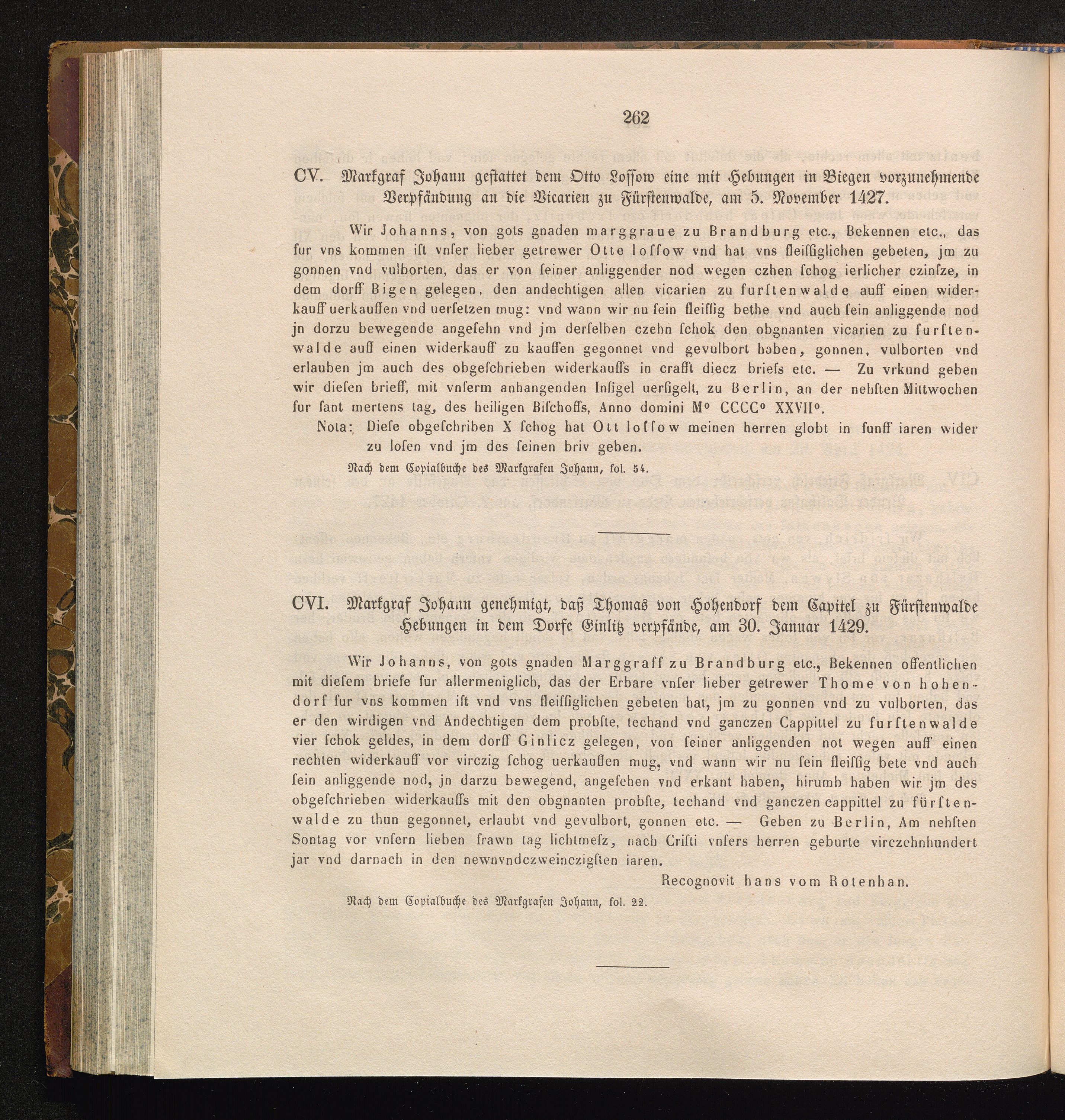 CVI. Markgraf Johann genehmigt, daß Thomas von Hohendorf dem Capitel zu Fürstenwalde[...]