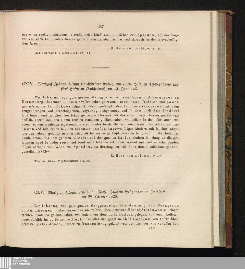 CXV. Markgraf Johann verleiht an Michel Storkow Besitzungen in Rathstock, am 28.[...]