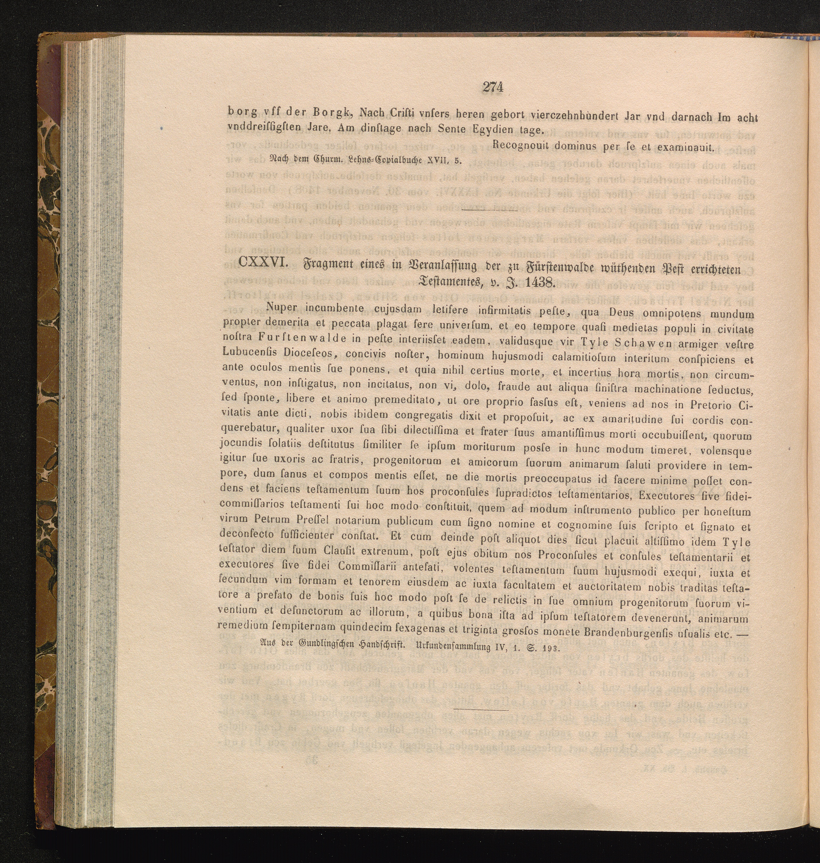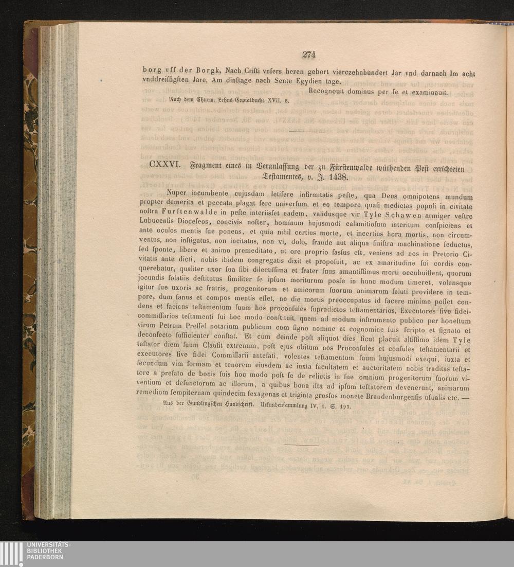 CXXVI. Fragment eines in Veranlassung der zu Fürstenwalde wüthenden Pest errichteten[...]