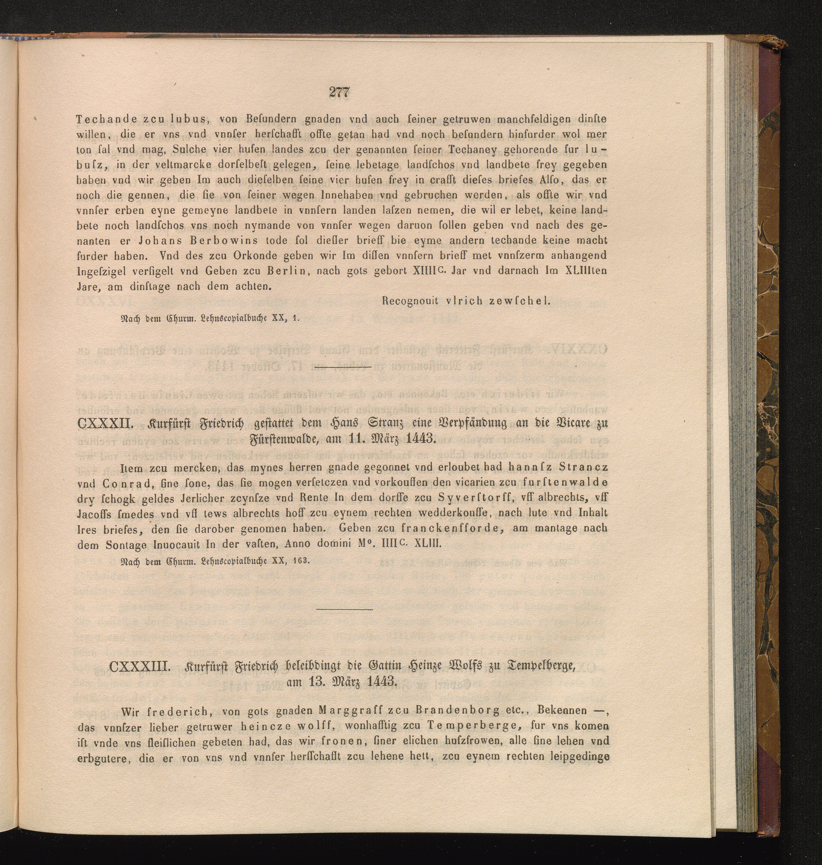 CXXXIII. Kurfürst Friedrich beleibdingt die Gattin Heinze Wolfs zu Tempelberge, am[...]