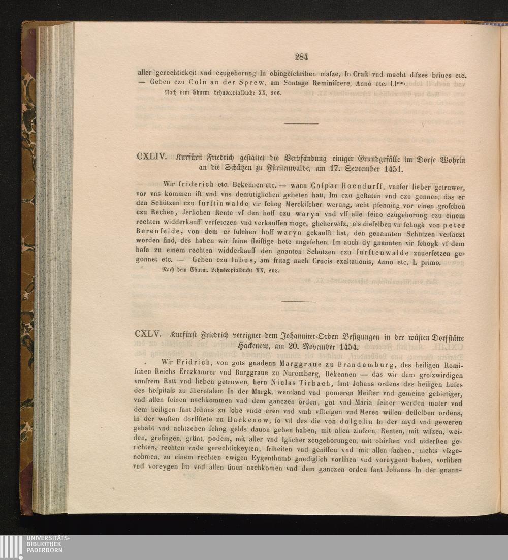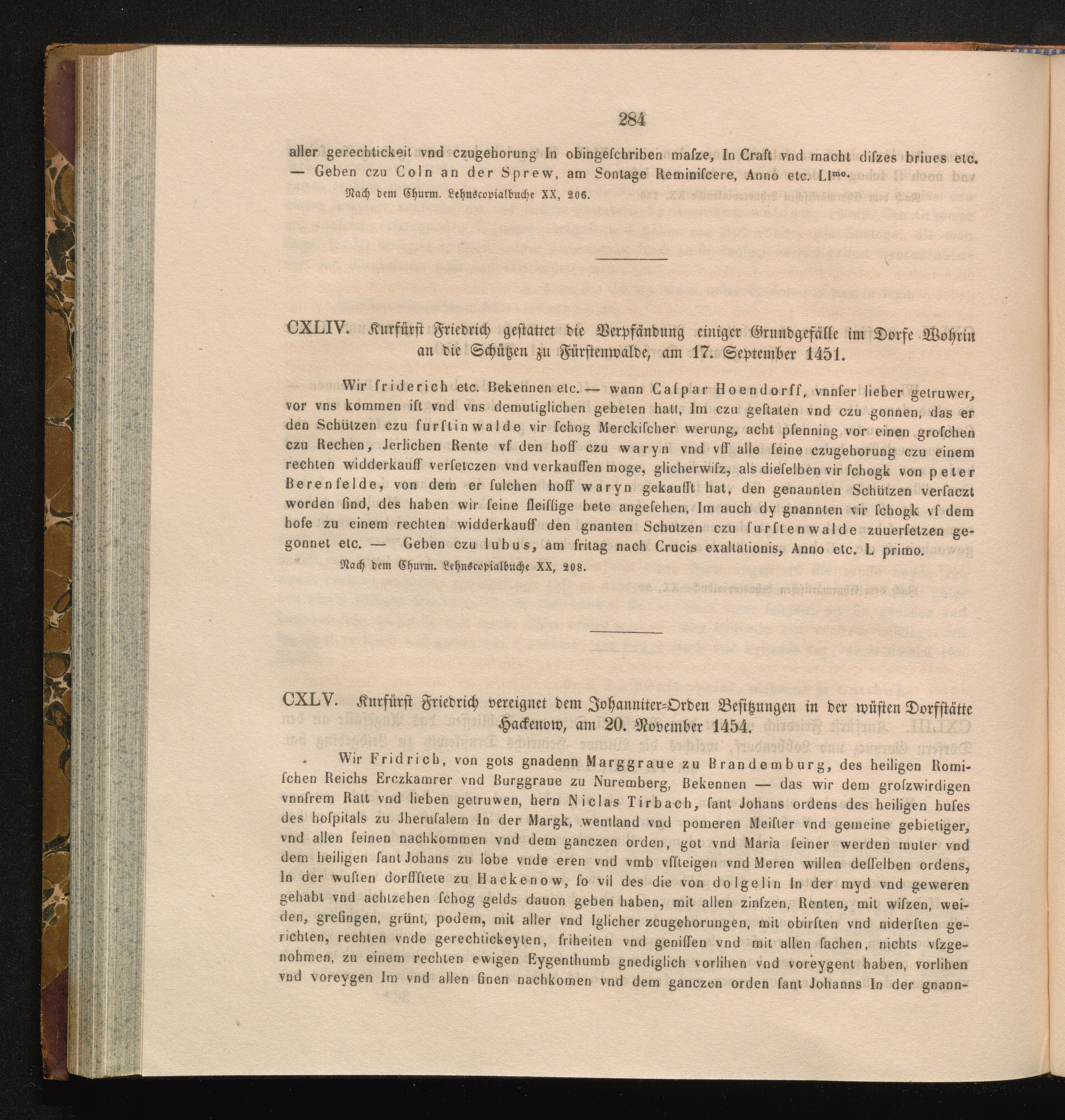 CXLV. Kurfürst Friedrich vereignet dem Johanniter-Orden Besitzungen in der wüsten[...]