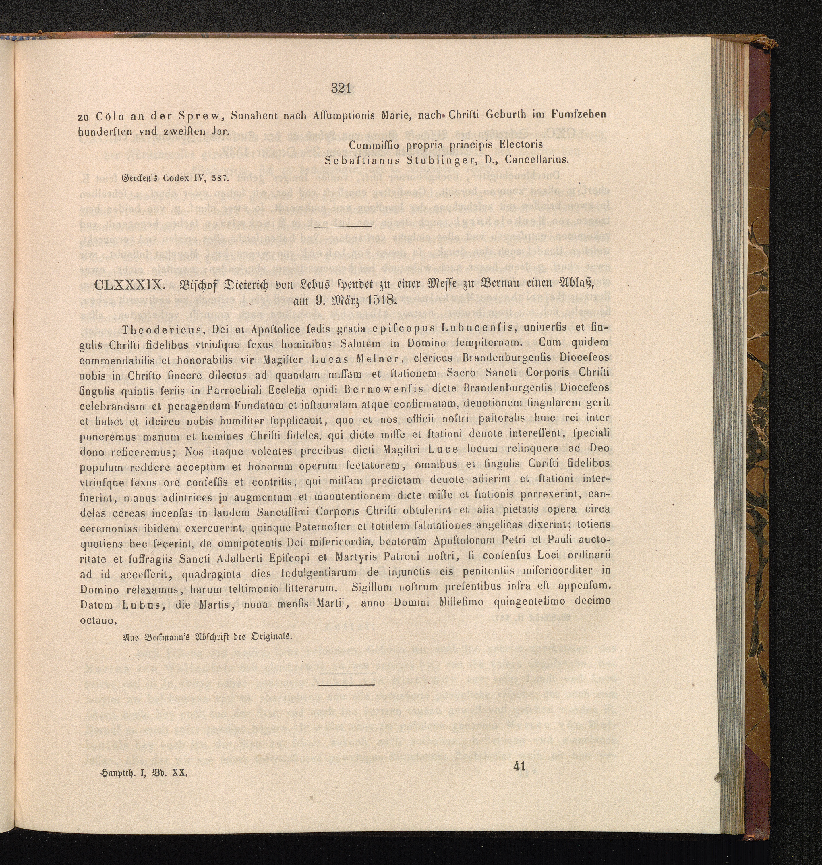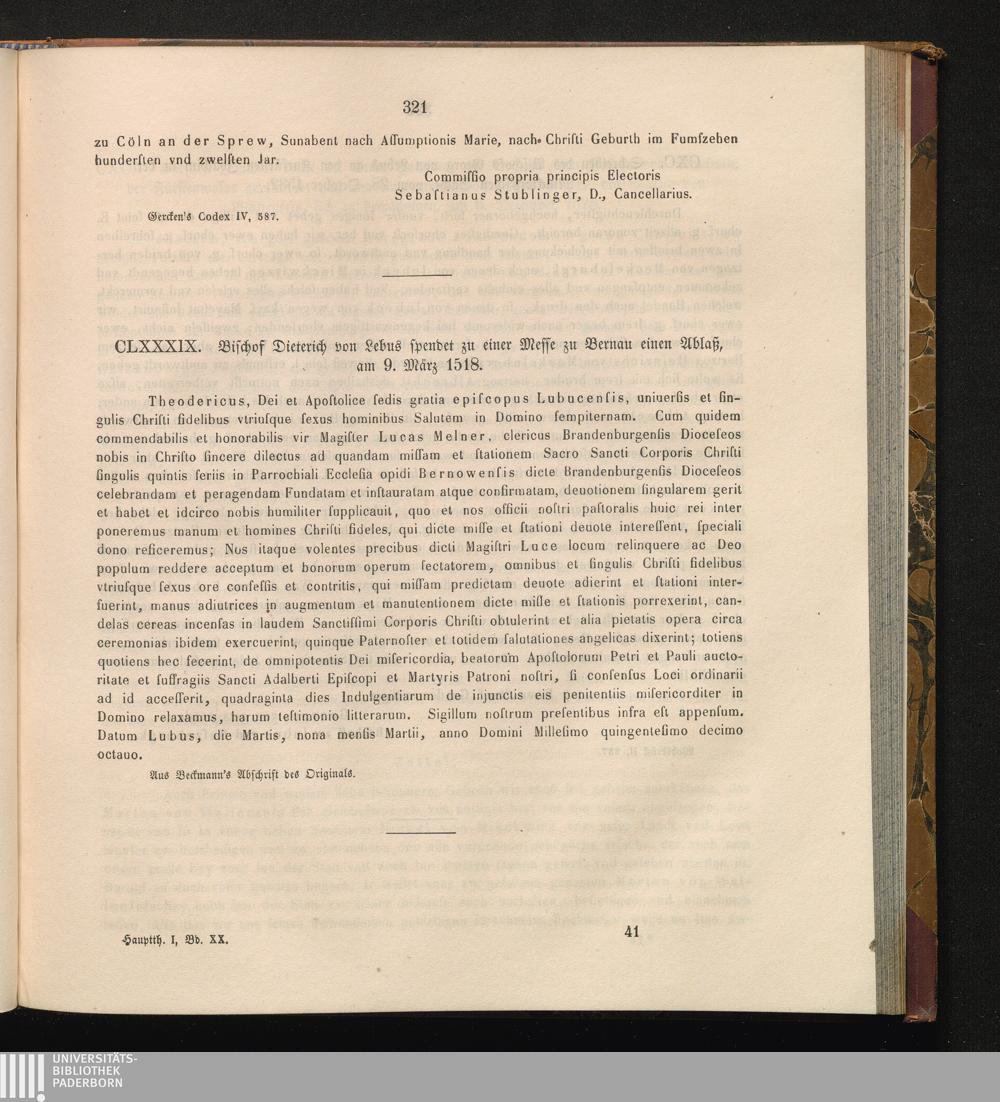 CLXXXIX. Bischof Dieterich von Lebus spendet zu einer Messe zu Bernau einen Ablaß,[...]