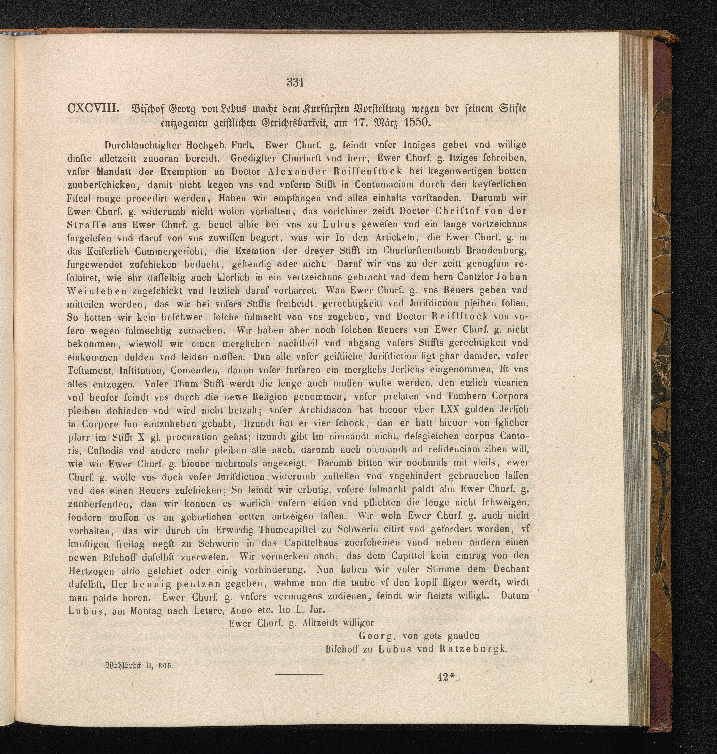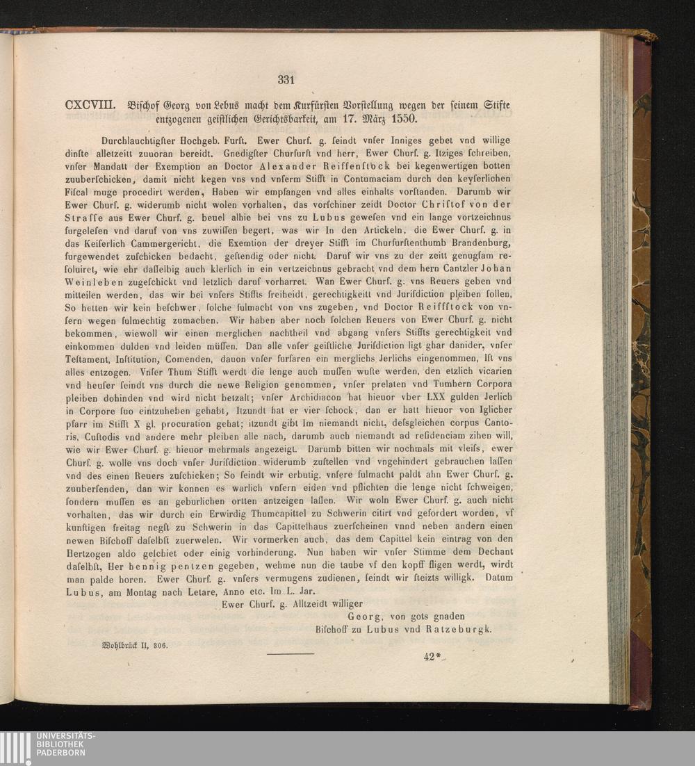 CXCVIII. Bischof Georg von Lebus macht dem Kurfürsten Vorstellung wegen der seinem[...]