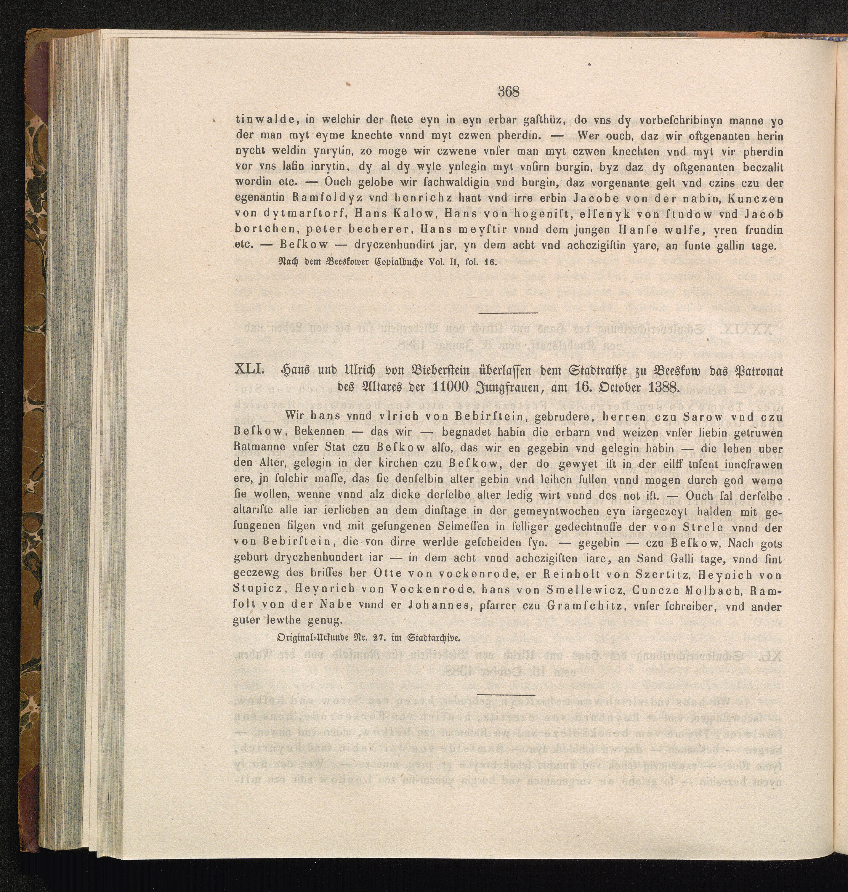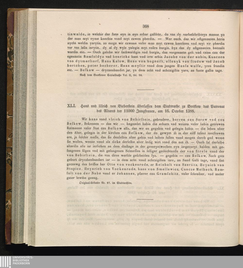 XLI. Hans und Ulrich von Bieberstein überlassen dem Stadtrathe zu Beeskow das Patronat[...]