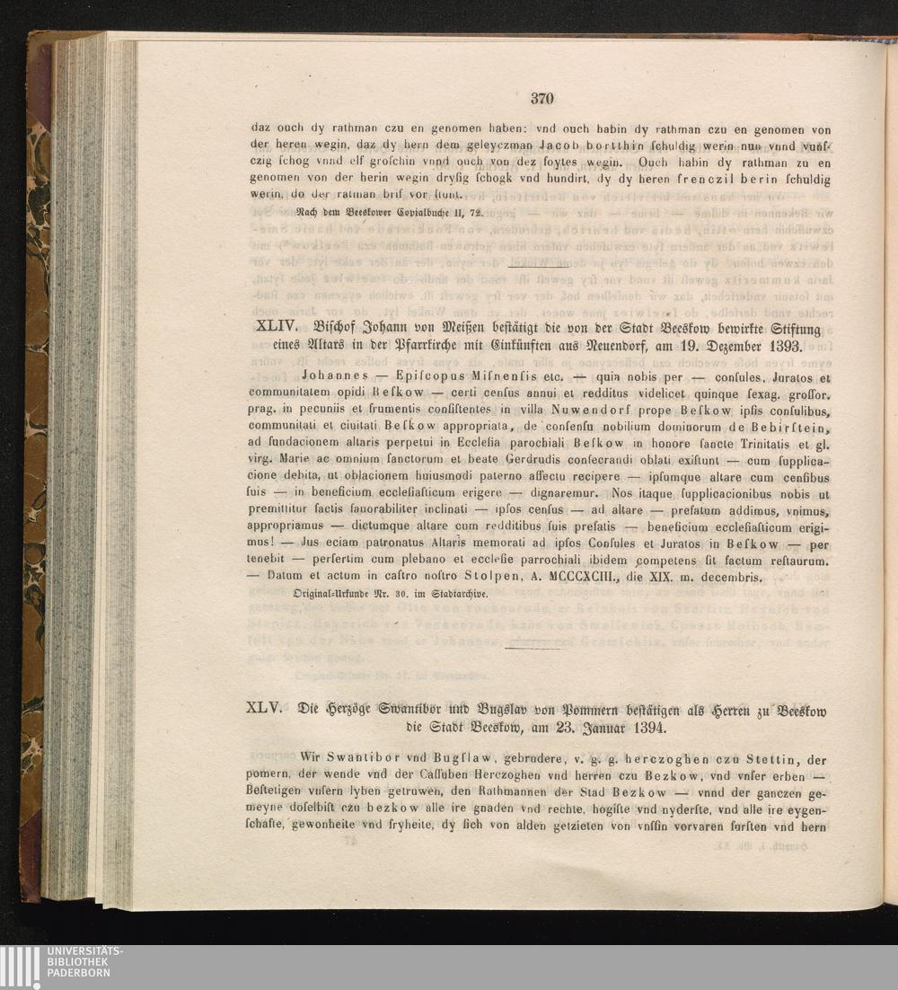 XLV. Die Herzöge Swantibor und Bugslav von Pommern bestätigen als Herren zu Beeskow[...]