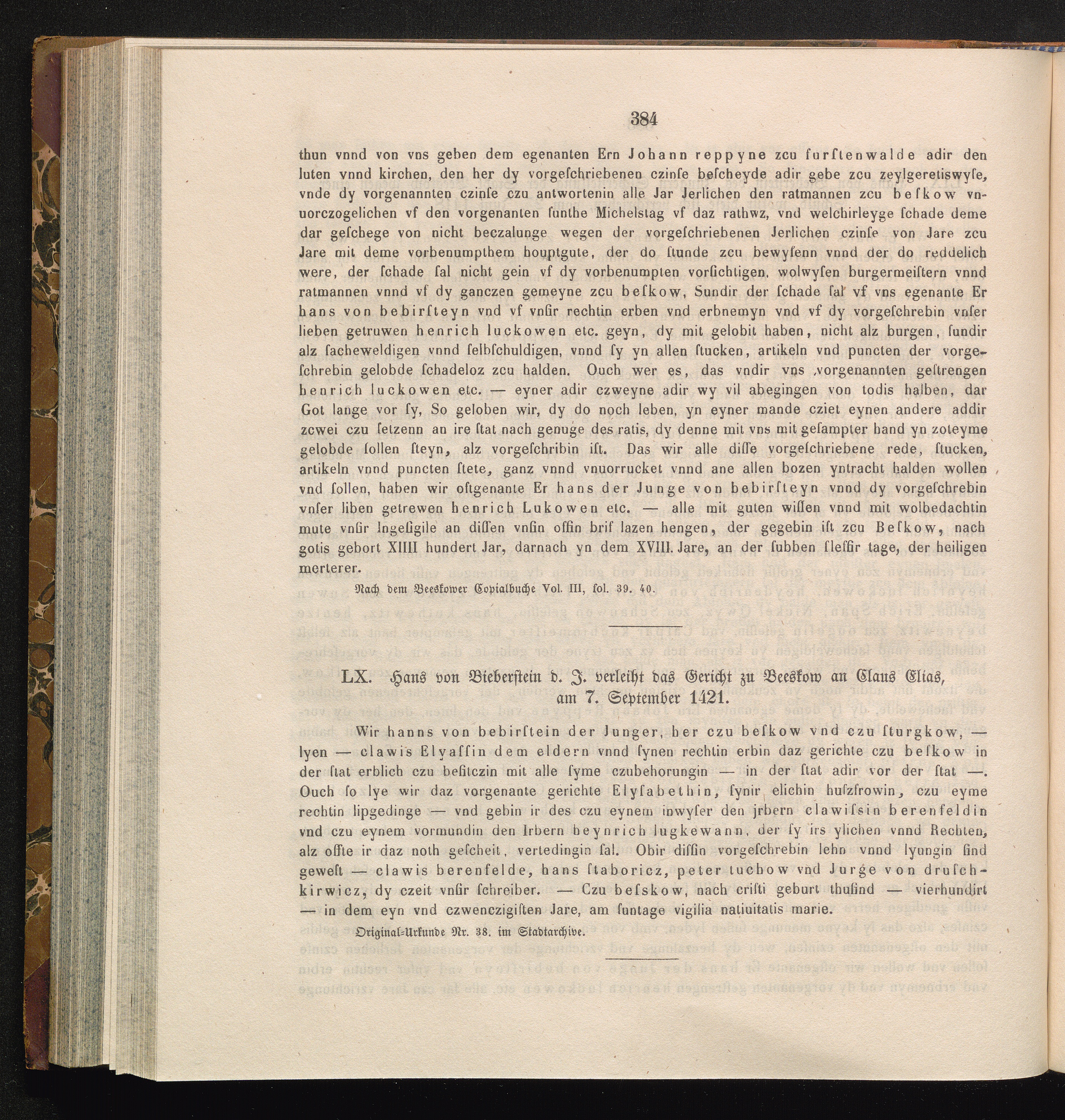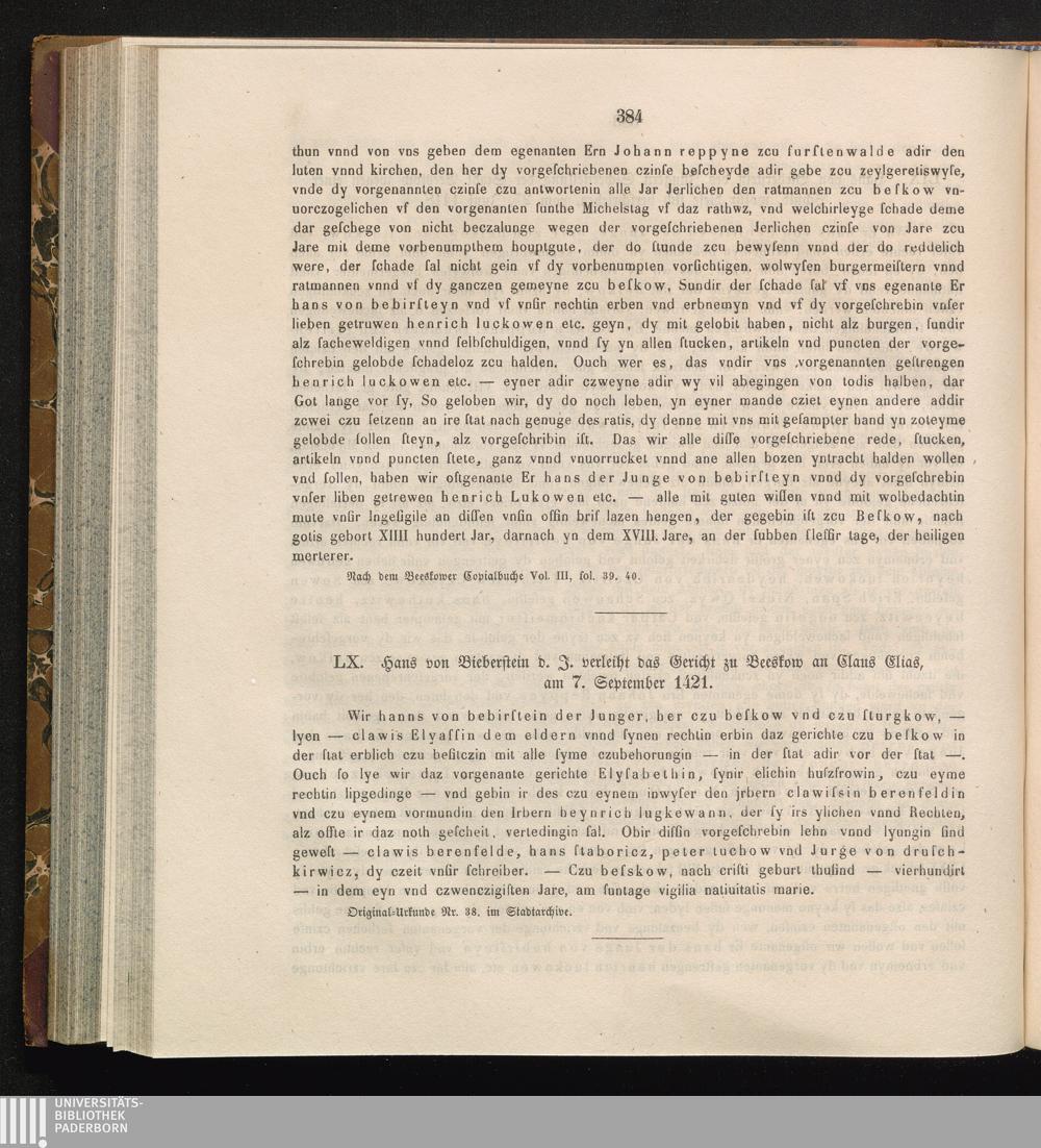 LX. Hans von Bieberstein d. J. verleiht das Gericht zu Beeskow an Claus Elias, am[...]