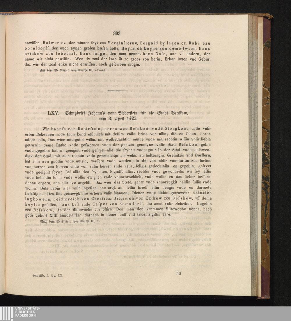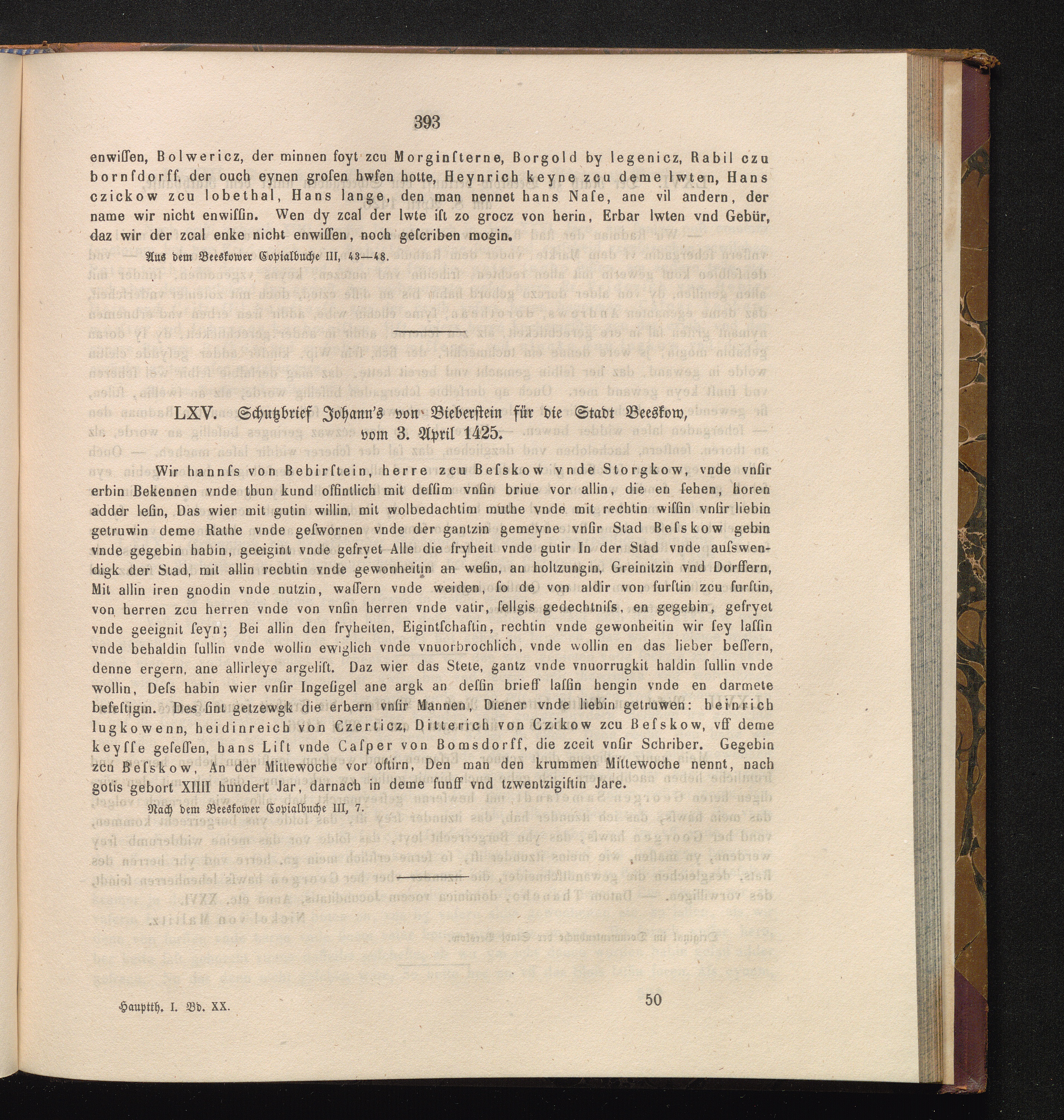 LXV. Schutzbrief Johann's von Bieberstein für die Stadt Beeskow, vom 3. April 14[...]
