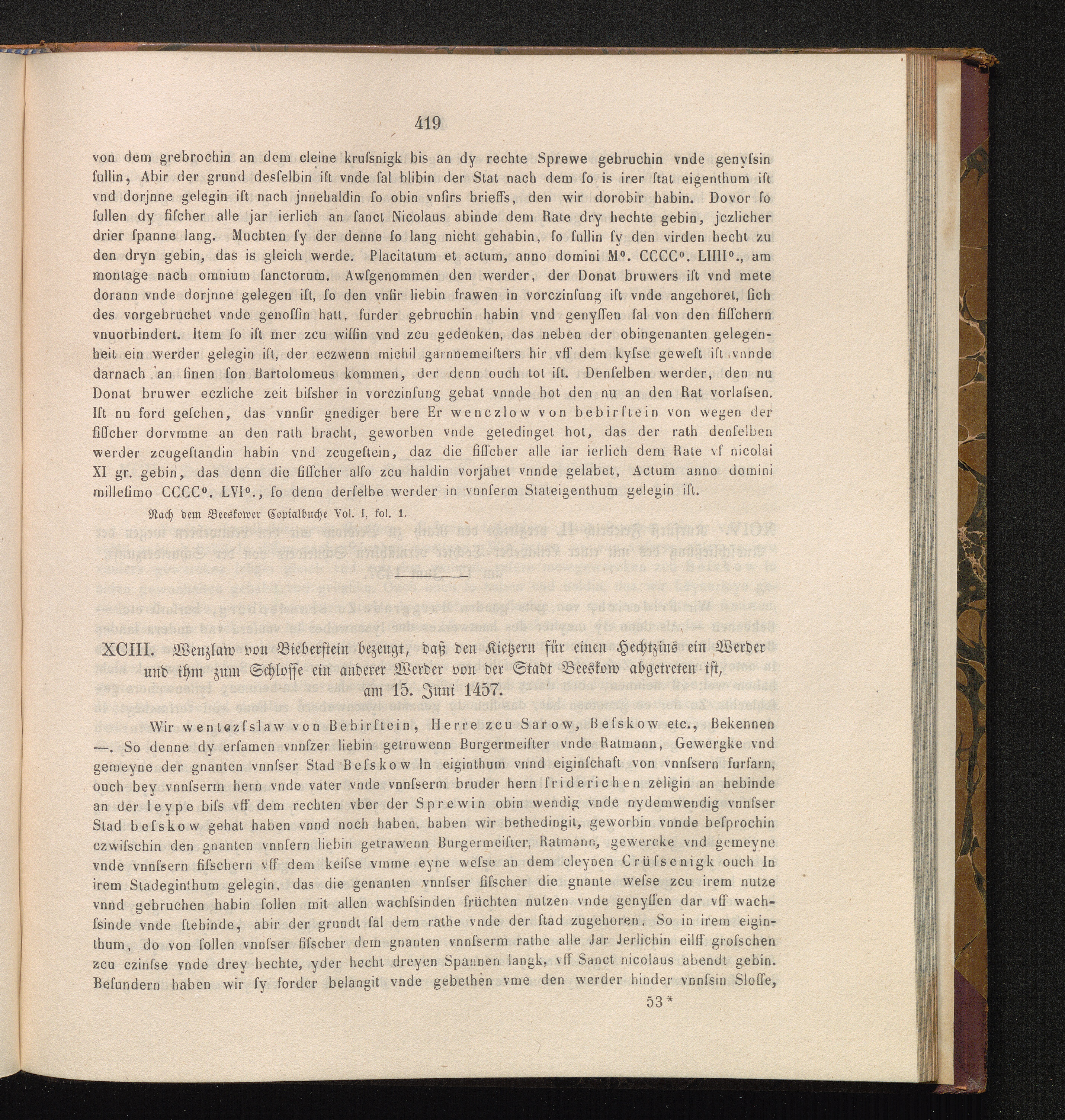 XCIII. Wenzlaw von Bieberstein bezeugt, daß den Kitzern für einen Hechtzins ein Werder[...]