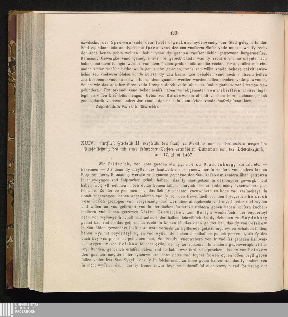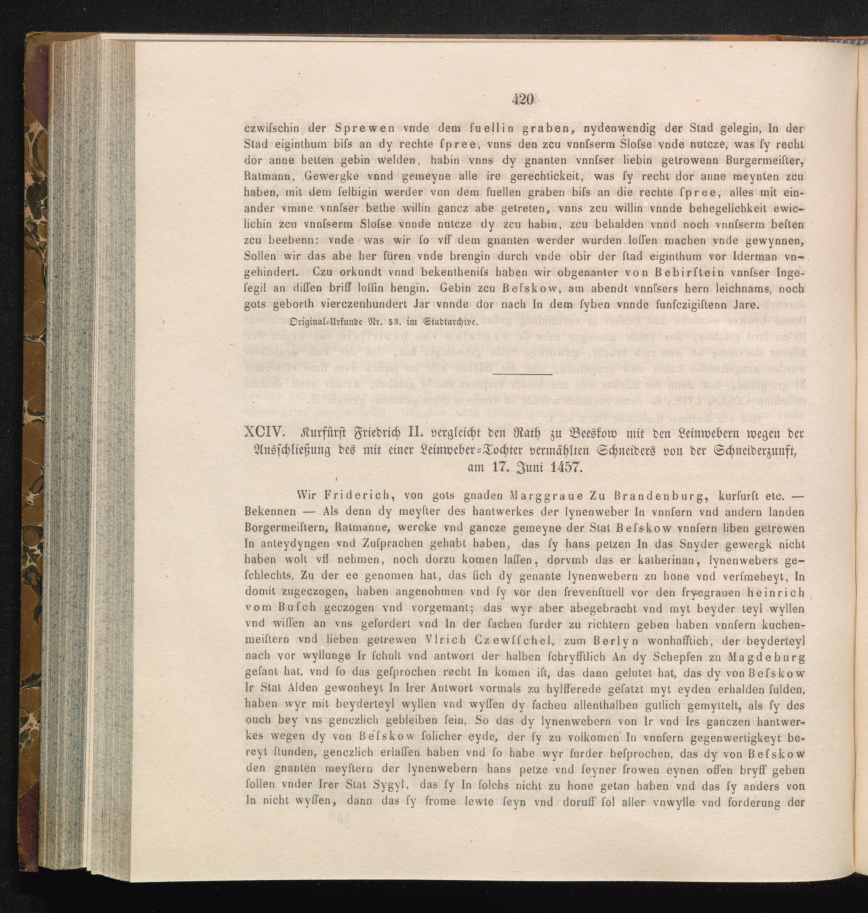 XCIV. Kurfürst Friedrich II. vergleicht den Rath zu Beeskow mit den Leinwebern wegen[...]