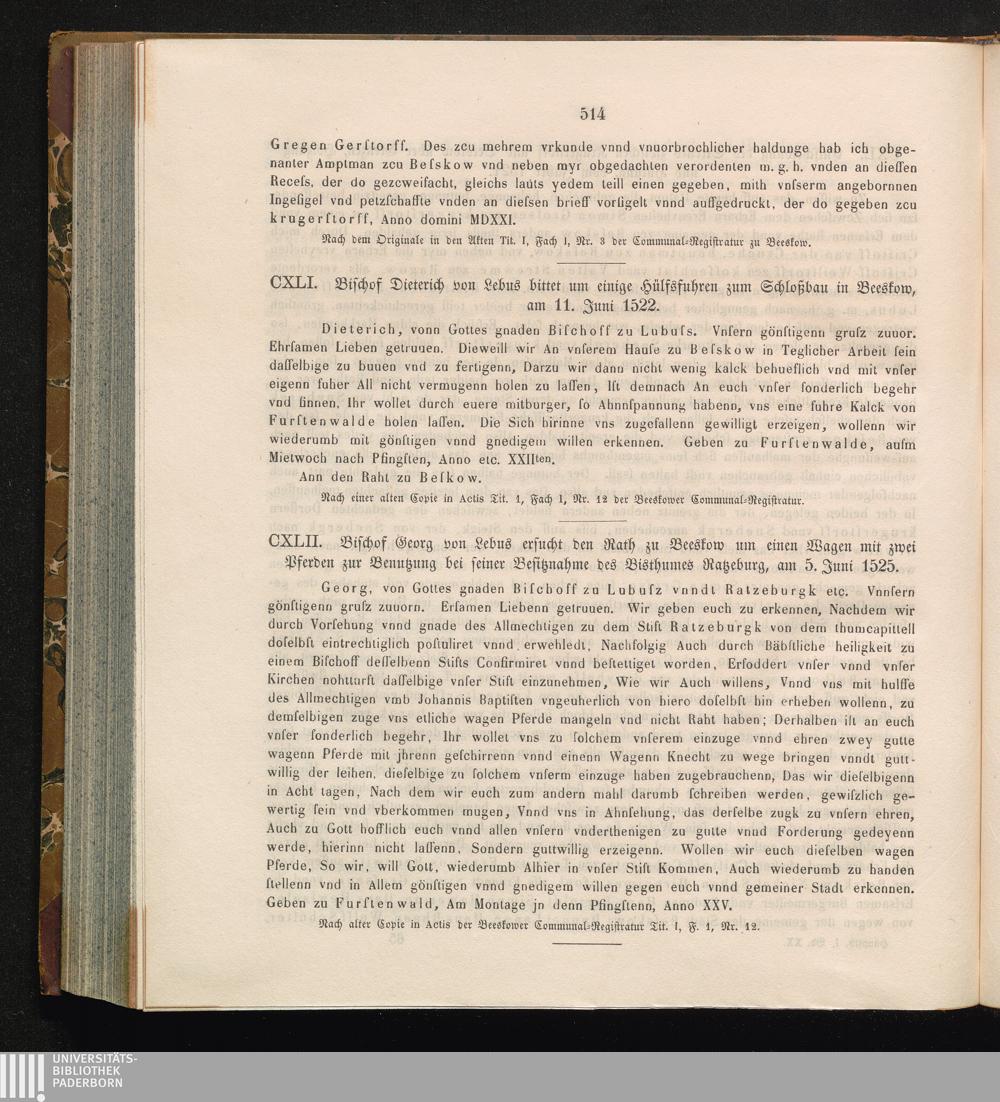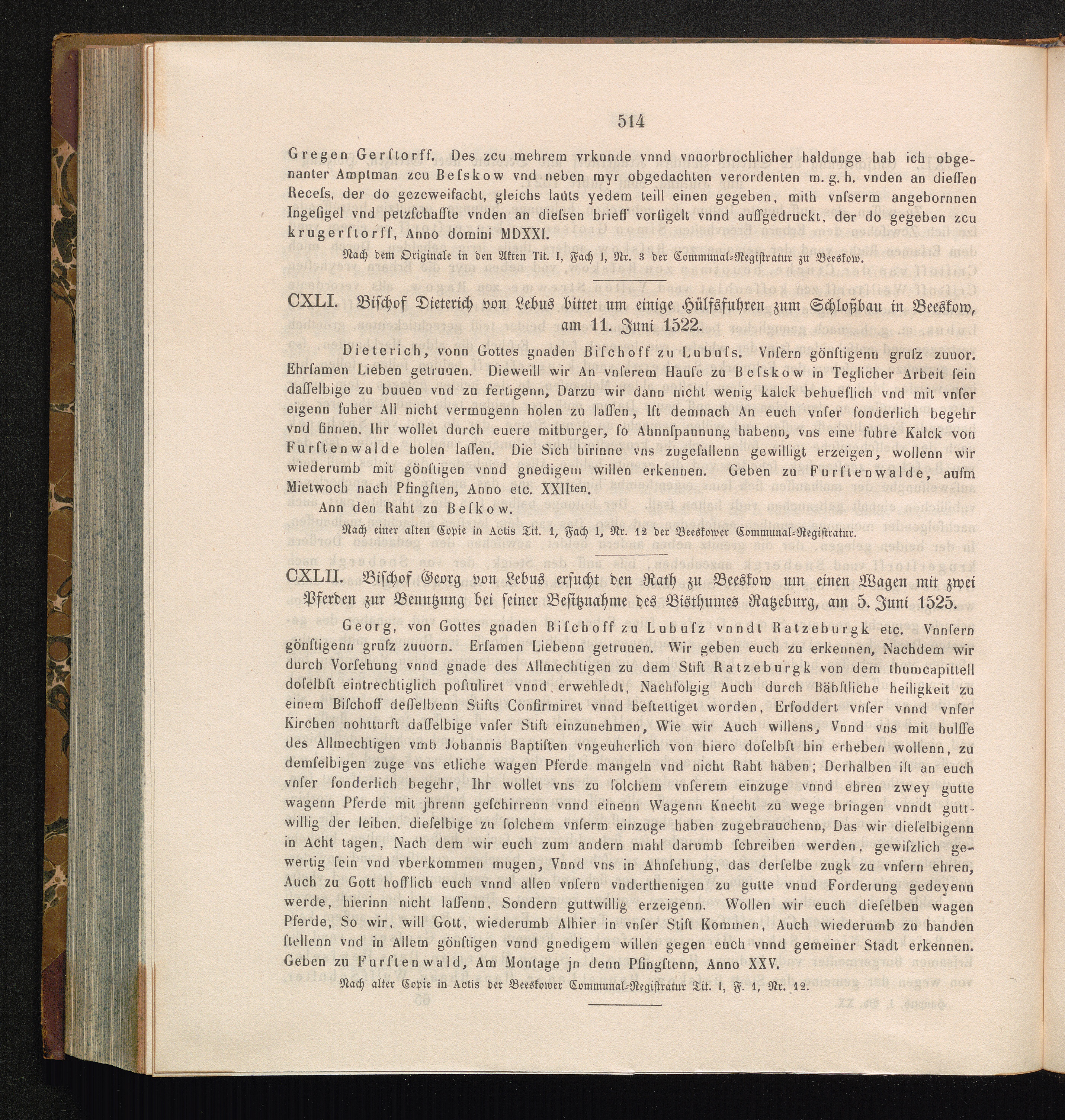 CXLII. Bischof Georg von Lebus ersucht den Rath zu Beeskow um einen Wagen mit zwei[...]