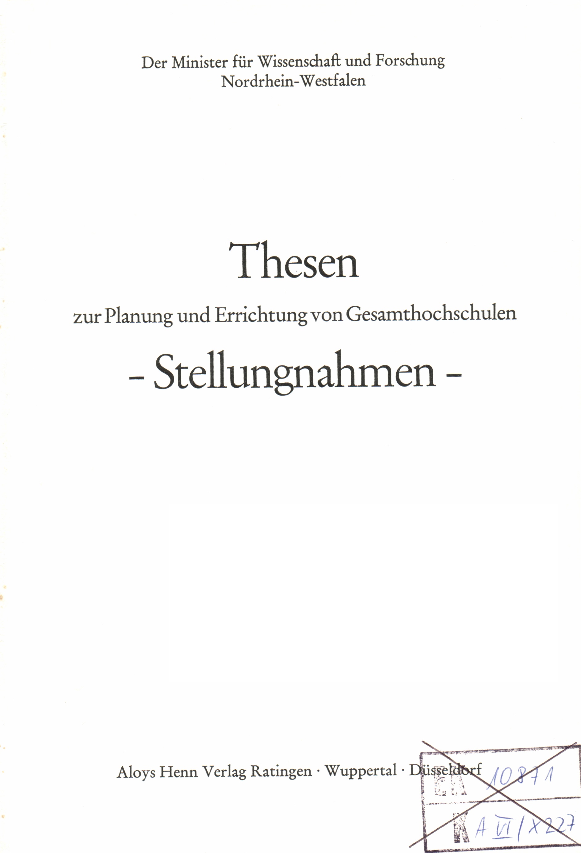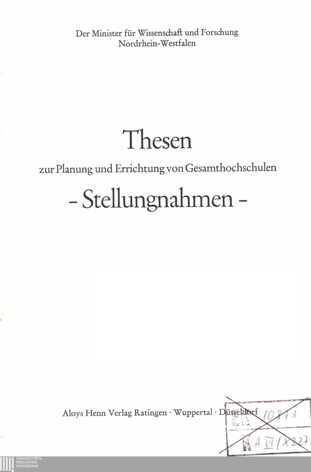 Thesen zur Planung und Errichtung von Gesamthochschulen : Stellungnahmen / Der Minister für Wissenschaft und Forschung, Nordrhein-Westfalen