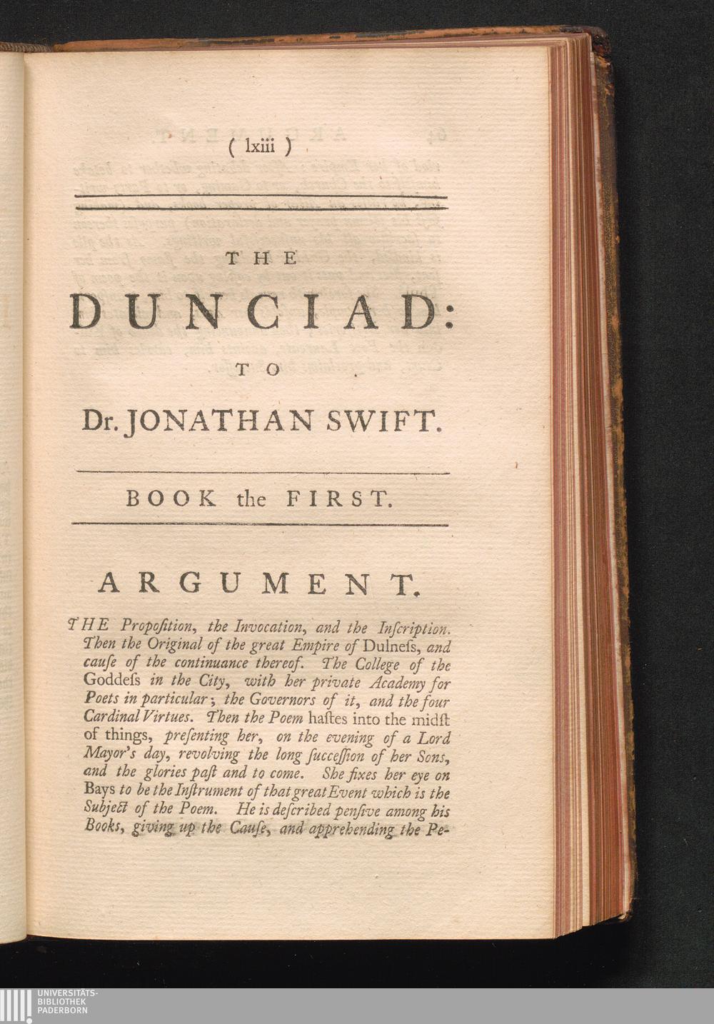 The Dunciad: To Dr. Jonathan Swift. Book the First. Argument.