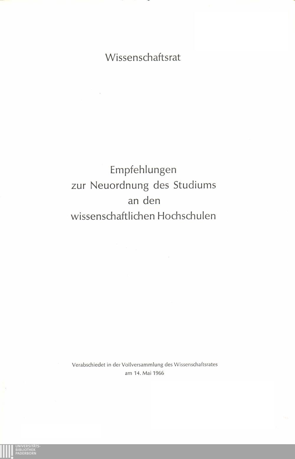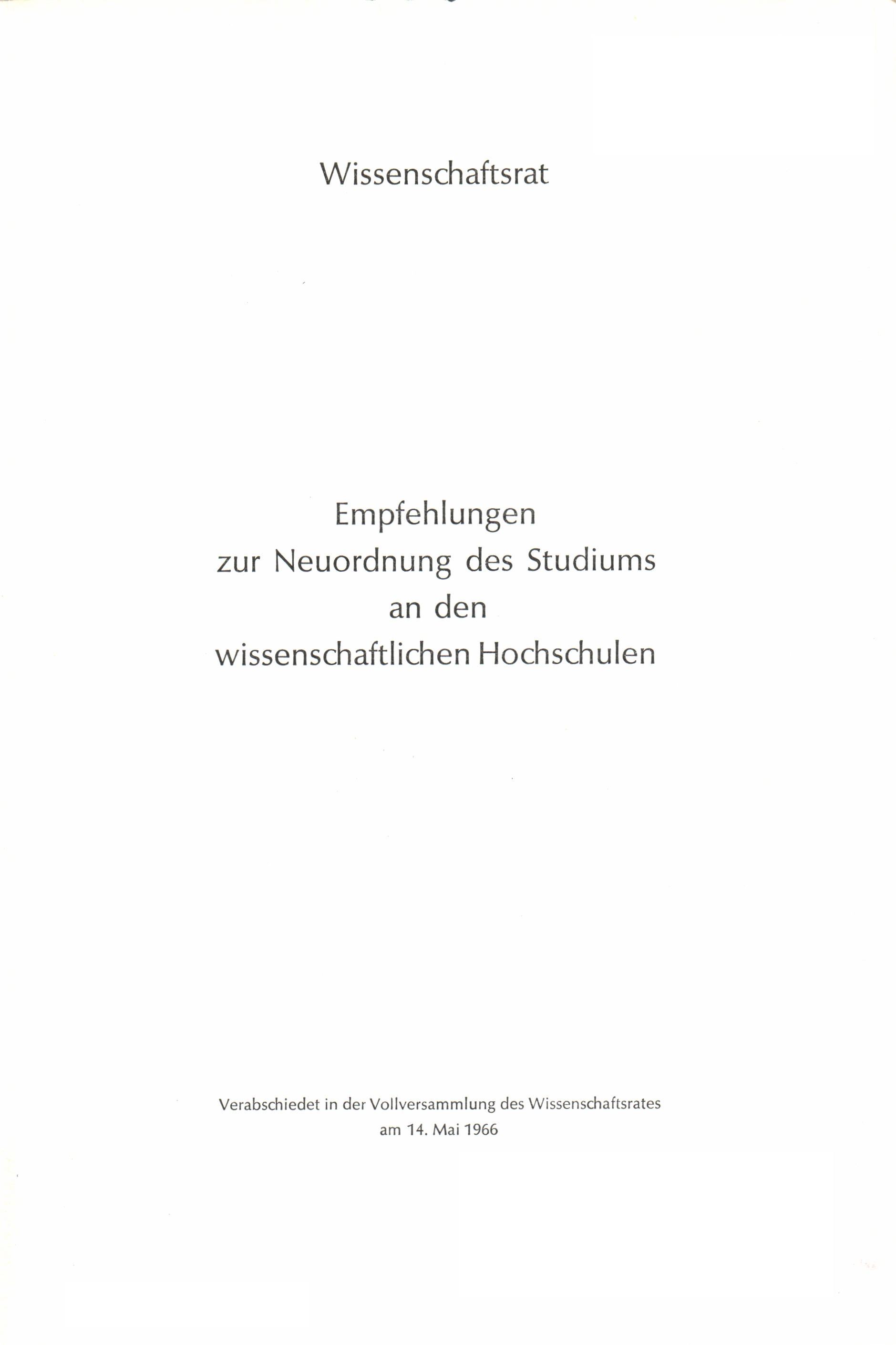 Empfehlungen zur Neuordnung des Studiums an den wissenschaftlichen Hochschulen : verabschiedet in der Vollversammlung des Wissenschaftsrates am 14. Mai 1966