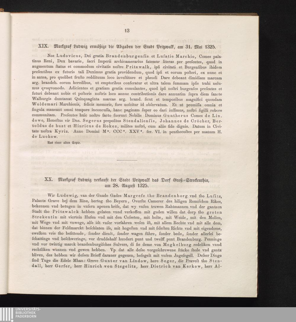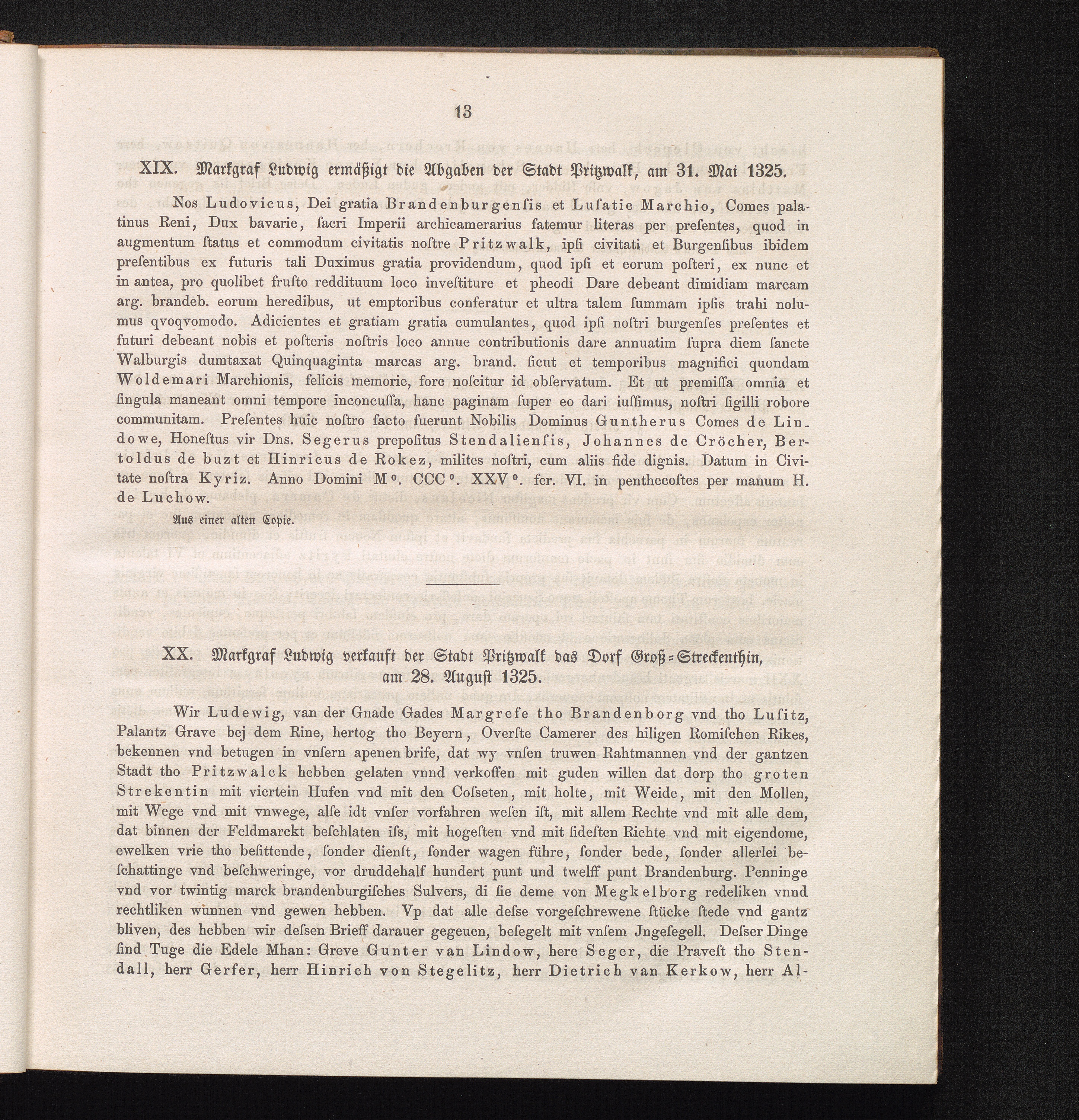 XIX. Markgraf Ludwaig ermäßigt die Abgaben der Stadt Pritzwalk, am 31. Mai 1325.