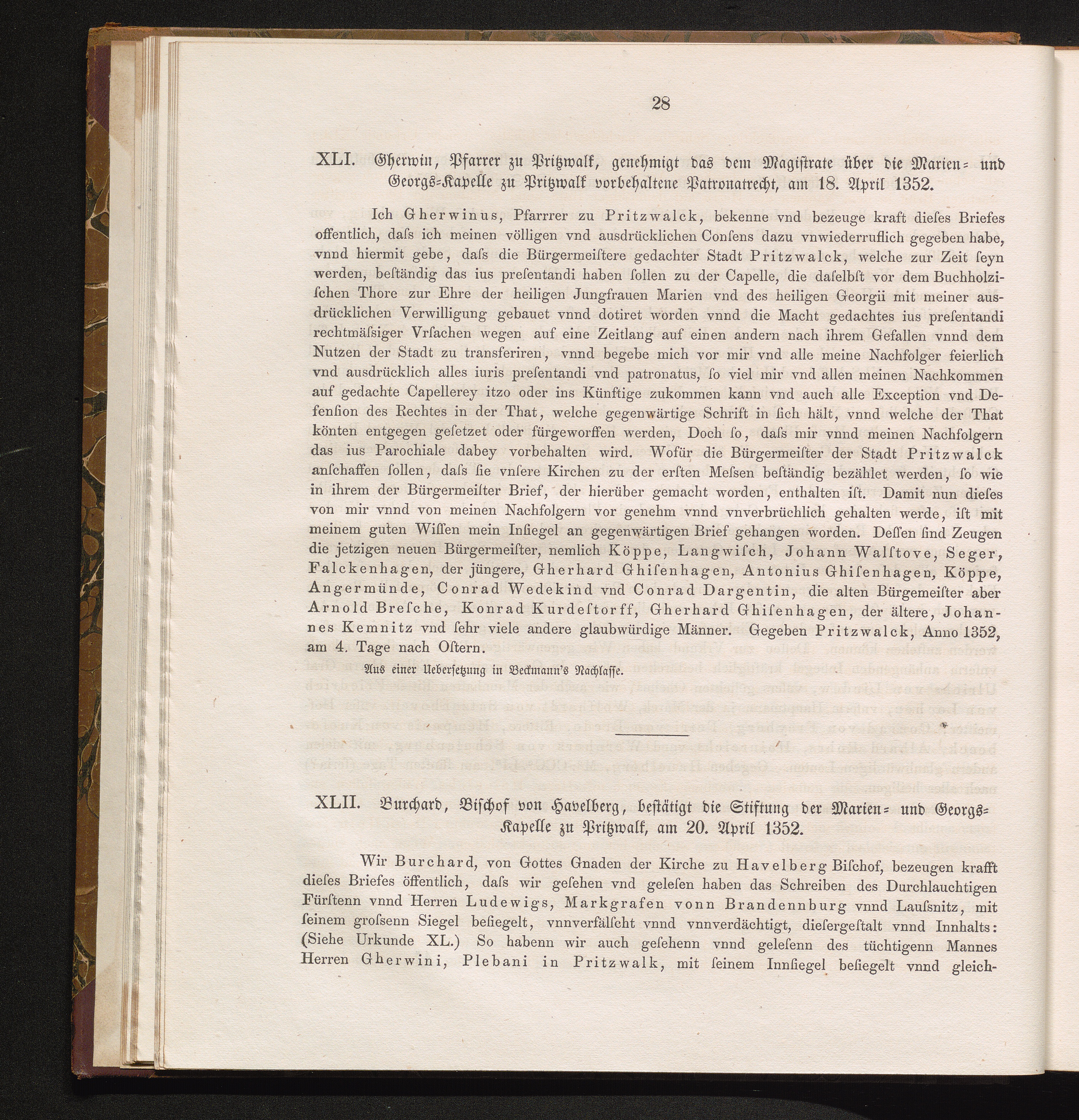 XLI. Cherwin, Pfarrer zu Pritzwalk, genehmigt das dem Magistrate über die Marien-[...]